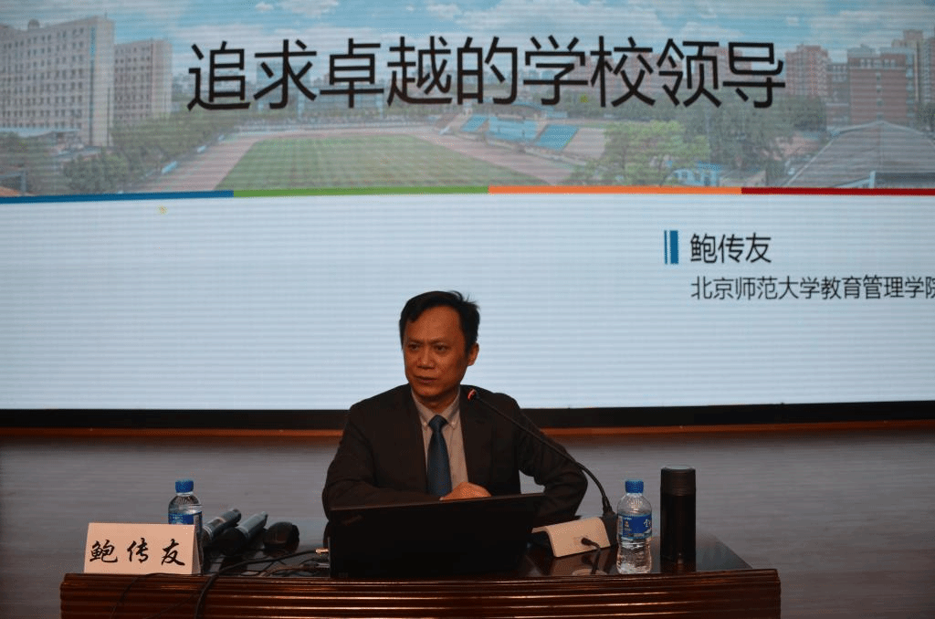 鲍传友教授以“领导、领导力和领导者素质”为切入点,阐述了“领导”的三个内涵:会激励他人、能带领团队、有共同目标,“领导力”是在“领导”过程中所表现出来的能力,这种能力不是领导者专属,而是所有人都有的。在此基础上他引发大家思考“校长领导力和教师的领导力有什么不同?谁的领导力更强?”,并从领导者应该具备勇气、公正、民主、移情、谦虚等个性特征和想象力、研究力、判断力、协调力、演说力等能力特征两个方面对领导者素质进行了说明。鲍传友教授还深入解析了一个卓越的校长应如何塑造领导能力:第一,学会用愿景与价值引领他人,思想领导是学校领导的核心,作为学校的领导者,首要任务是明确学校的发展方向,明确领导和管理的区别,确立理念和核心价值观。在此,鲍教授以北京清华附小“让学生站在正中央”和重庆谢家湾小学“六年影响一生”为例解析了校长应该如何构建富有特色和感召力的学校价值体系。第二,学校的领导者要会了解人,懂得尊重人,学会激励人,精通用人识人的艺术。第三,鲍教授引用拿破仑的“一头狮子带领99只绵羊,可以打败一只绵羊带领的99头狮子”说明团队的重要性,作为学校的领导者,应加强团队建设,营造合作文化。最后,鲍教授以“团队的重要性”视频来结束本场讲座,并从中引出一个团队要有人领导,有明确分工,有规则,有目标,最重要的是,还要有人文关怀这个发人深省的道理。