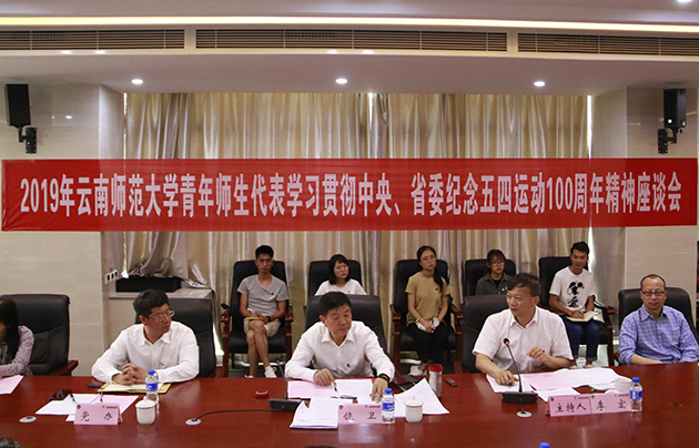 座谈会上,参会人员观看了2019年4月30日中共中央总书记、国家主席、中央军委主席习近平在纪念五四运动100周年大会上的重要讲话视频,重温大会盛况,学习大会精神。随后,青年师生代表围绕习近平总书记在纪念五四运动100周年大会上的重要讲话精神,结合自身实际,从不同角度谈认识,说体会,分享学习心得。马克思主义学院青年教师代表、毛泽东思想和中国特色社会主义理论体系概论教研室主任李庚伦博士,能源与环境科学学院硕导、2017年云南省最关爱学生班主任荣誉称号获得者王云峰博士,教育科学与管理学院团委书记、第七届全国高校辅导员素质能力大赛二等奖获得者赵德虎先后围绕自己的工作实际,阐述了作为青年教师不仅要担当铸魂育人的责任,还要贴近青年、关心青年、关爱青年,以坚定的政治信仰引领青年,在实现中华民族伟大复兴中国梦的进程中不断开拓创新、奋发有为。2018年团中央“践行社会主义核心价值观先进个人暨中国电信奖学金”获得者、2019年第十四届云南省大学生年度人物、信息学院2015级空间信息与数字技术专业本科生刘宇晨,优秀团员、研究生支教团副团长、哲学与政法学院2015级思想政治教育专业本科生骆鑫,校学生委员会主席、体育学院2015级体育教育专业本科生林思思,永利官网“党的十九大精神”学生宣讲团成员、传媒学院2017级播音与主持艺术专业本科生陶毅然分别分享了自己的所学所思。在重温五四精神后,他们对新时代中国青年的使命与担当有了更加深刻的理解,深切感受到只有在党的领导下,把个人梦融入中国梦,响应党的号召,到祖国和人民需要的地方去,当代青年大学生才能担当起新时代赋予的责任与使命,才能实现最有意义的人生价值。