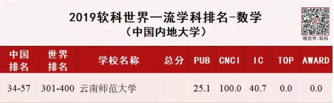 软科(6月26日)正式发布2019“软科世界一流学科排名”(ShanghaiRanking's Global Ranking of Academic Subjects)。2019年排名覆盖54个学科,涉及理学、工学、生命科学、医学和社会科学五大领域。中国内地高校表现强势,共有233所上榜,上榜总次数2001次。云南共有3所高校的6个学科上榜。永利官网数学学科上榜,国内排名34-57名,世界排名301-400名。