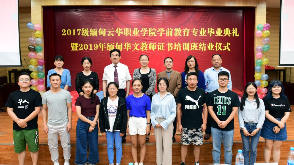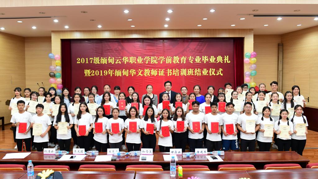 云南华文学院王秀成院长为2017级缅甸云华职业学院学前教育专业毕业学生逐一颁发学习证明。出席仪式的全体领导和嘉宾为2019年缅甸华文教师证书培训班全体学员颁发培训结业证书并合影留念。