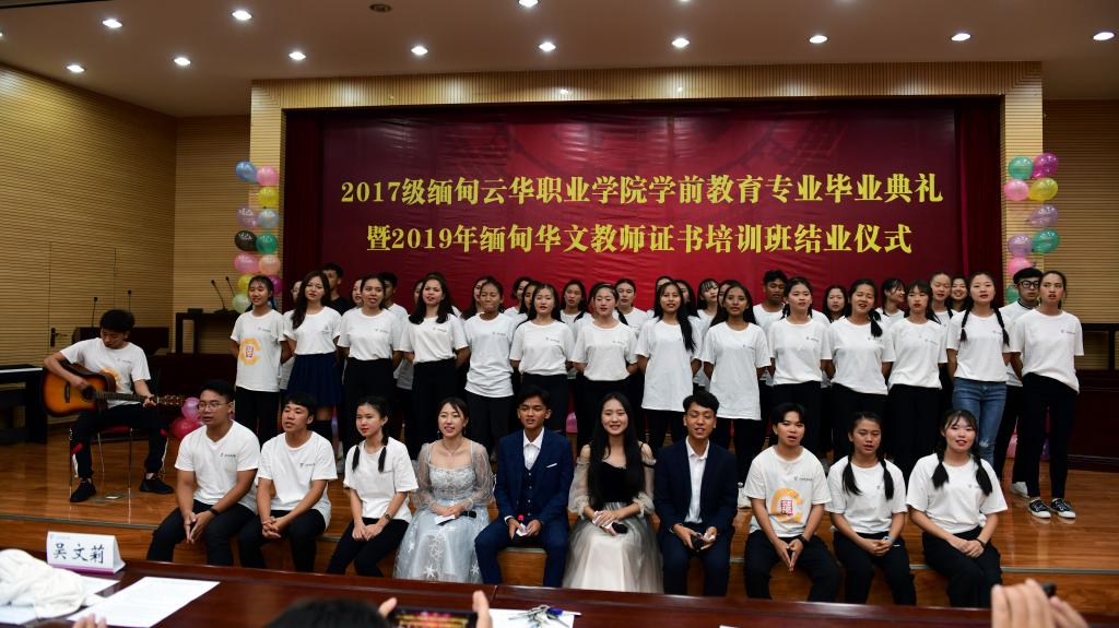 7月25日晚,永利官网云南华文学院举办了2017级缅甸云华职业学院学前教育专业毕业典礼暨2019年缅甸华文教师证书培训班结业仪式。云南省委统战部国外侨务处副处长甘露云、云南海外文化教育中心缅甸分中心主任唐建军,云南华文学院相关领导、教师以及2019年缅甸华文教师证书培训班、2019年缅甸华文教师教材教法培训班的89名缅甸学员参加了活动。仪式由云南华文学院常务副院长段洁云主持。