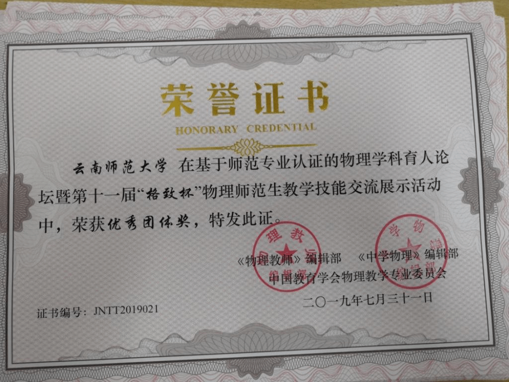 经过紧张激烈的比赛,永利官网学生表现出色,成绩喜人,为学校赢得了荣誉。在教学技能交流展示活动中,本科生董莎、余莎莎、李丹,研究生董瑞彩、陈瑞、冯子晴等同学荣获一等奖6项,本科生罗瑞怡、王迪,研究生王璐、赖美君、郑原琛、颜国英等同学荣获二等奖6项,本科生杨玉洁,研究生杨瑶、刘艳梅、姬影、谢蕊蕊等同学荣获三等奖5项。在创新实验设计与自制教具展示活动中,本科生周秋宇、赵志文、董莎、王迪、赵添、李丹,研究生赖美君、颜国英等同学荣获一等奖6项,本科生罗瑞怡、余璇、杨玉洁、郑洁琪、韩丽梅、陈民泽、陈东丽、余莎莎,研究生郑原琛、董瑞彩、王璐、姬影等同学荣获二等奖11项,研究生陈瑞、冯子晴、杨瑶、刘艳梅、谢蕊蕊等同学荣获三等奖5项。指导教师荣获国家级“优秀指导教师”称号,永利官网荣获“优秀团体奖”。