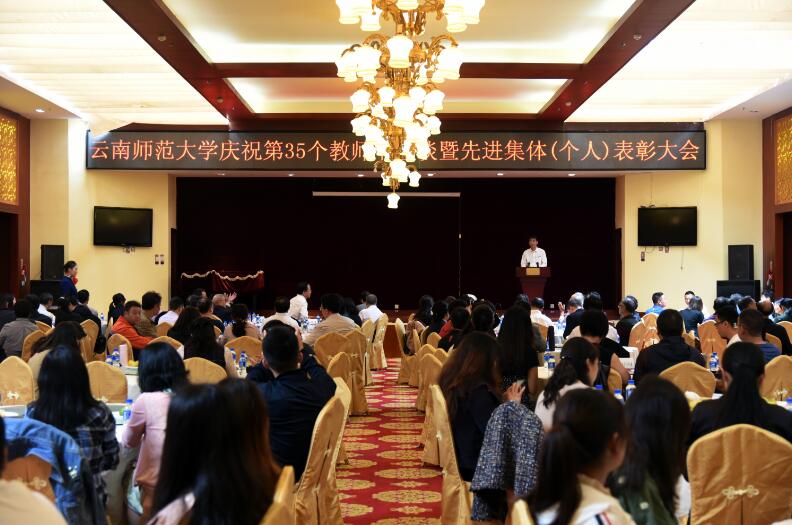 会上,校党委饶卫书记作了讲话。饶书记首先代表学校党委,向辛勤耕耘、默默奉献的全校教职工致以节日的问候,向受表彰的先进集体、先进个人表示热烈的祝贺。饶书记强调,党的十八大以来,学校在习近平新时代中国特色社会主义思想的引领下,加快推进教师教育为特色的高水平大学建设,取得了一系列成绩,这些成绩的取得是省委省政府正确领导的结果,是一代代师大人不忘初心、牢记使命,弘扬传统、改革创新,担当作为、艰苦创业的结果。饶书记表示,长期以来,广大教职工弘扬西南联大精神,教书育人、管理育人、服务育人,爱岗敬业、甘为人梯,为广大学生的成长成才和学校的发展做出了积极贡献,涌现出了一批争先进、做表率、出实绩、讲奉献的优秀教师。他们用自己对教师职业的热爱和责任,在自身平凡的岗位上做出了不平凡的业绩,是我们学习的榜样。饶书记寄语全校教职工要切实做到政治过硬,时刻铭记立德树人使命,勇于创新创造、锻造过硬本领,紧密团结在以习近平同志为核心的党中央周围,不忘初心、牢记使命,与学校党委同心同德、同向同行,以崭新的奋进姿态迎接新中国成立70周年华诞,为云南全面建成小康社会,加快实现教育现代化做出新的更大贡献。