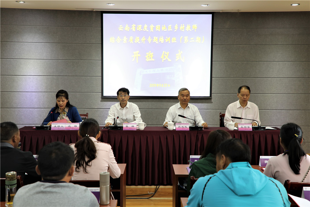 为深入贯彻落实精准扶贫基本方略,创新教育扶智扶贫模式,由云南省总工会、云南省教育厅主办,云南省教育卫生科研工会、云南西南联大干部教育学院合作组织实施的“云南省深度贫困地区乡村教师综合素质提升专题培训班(第二期)”,于9月23日上午在一二一西南联大校区明达楼406报告厅举行开班仪式,省总工会党组成员、副主席尚建明,8858cc永利唯一官方网党委副书记张玮,省教育卫生科研工会经审会主任王明雷,来自怒江州、迪庆州、昭通市的100名学员参加了开班仪式。仪式由云南西南联大干部教育学院专职副院长沈旸主持。