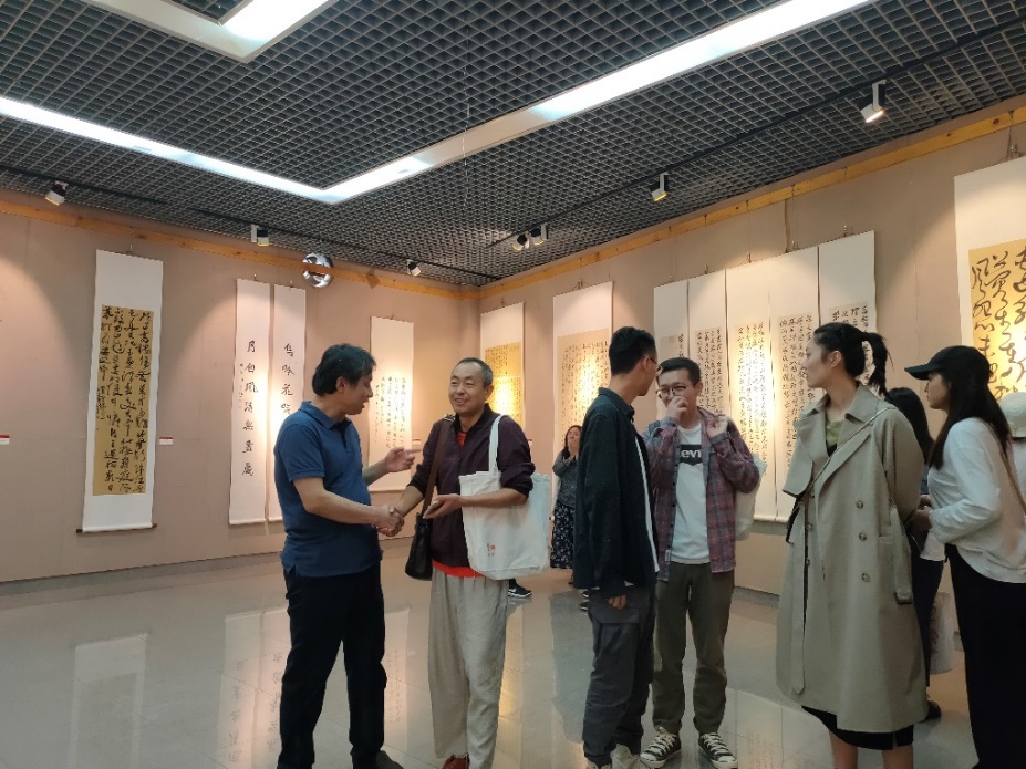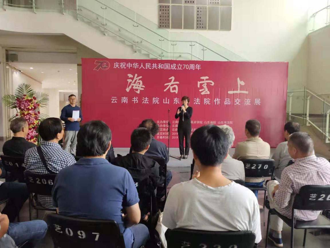七十载沧桑铸就时代华章,五千年翰墨礼赞盛世中国,为庆祝中华人民共和国成立七十周年,2019年9月20日上午,由8858cc永利唯一官方网美术学院、山东画院和山东书法院主办,云南书法院承办的“海右云上”云南书法院山东书法院作品交流展开幕式在8858cc永利唯一官方网呈贡校区美术学院举行。山东书法院常务副院长,中国书法家协会理事、草书委员会委员赵长刚,山东书法院副主席吴勇军,山东书法院秘书长刘上林,山东书法院书法家翟聖亮,云南省文联原副主席、云南书法家协会常务副主席林政军,云南省书法协会副主席李轶,中国书法家协会理事、行书委员会委员、云南书法院副院长、8858cc永利唯一官方网美术学院教授刘新德,8858cc永利唯一官方网宣传部、人事处、美术学院等单位相关负责人参加了开幕式。