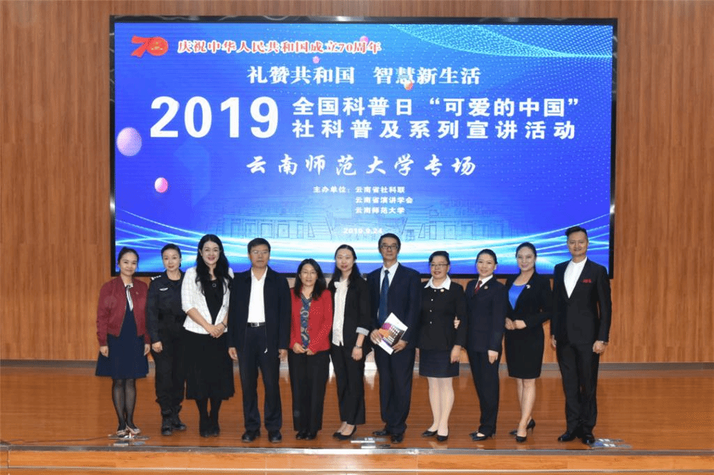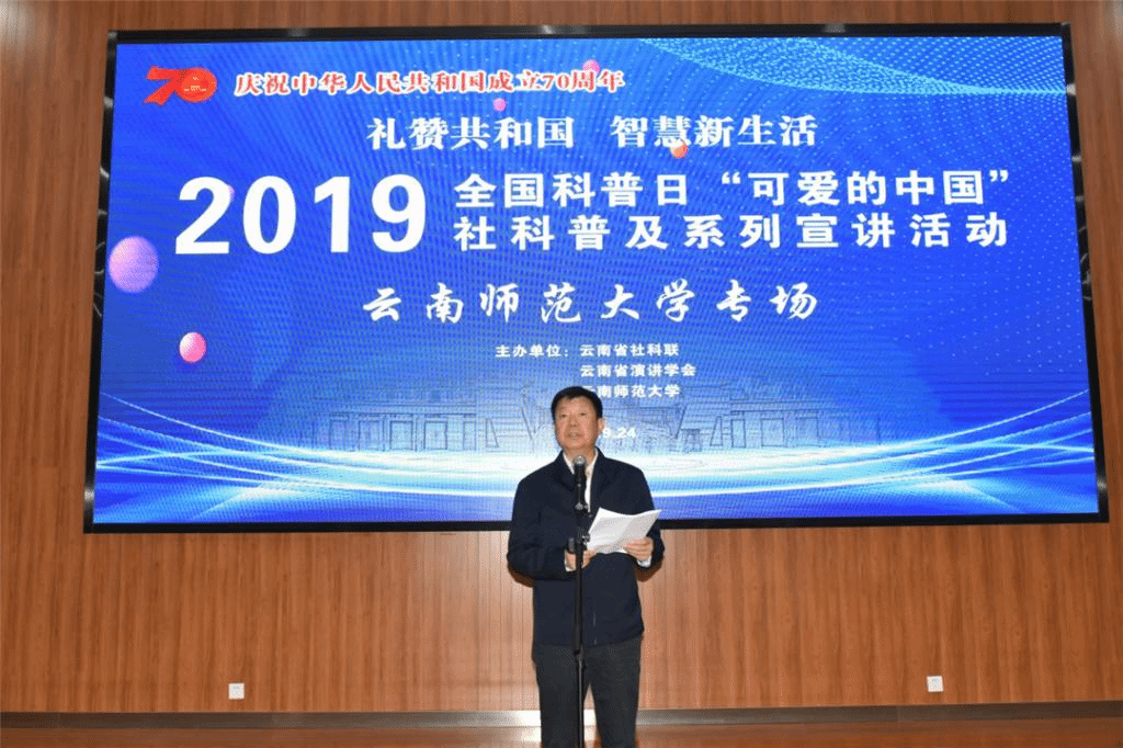 9月24日,由云南省社科联、云南大学、8858cc永利唯一官方网、西南林业大学、曲靖师范学院、玉溪师范学院、云南省演讲学会联合主办的全国科普日——“可爱的中国”云南省社科普及系列宣讲活动在永利官网举行。本次活动以“礼赞新中国、智慧新生活”为主题,云南省社会科学界联合会领导,8858cc永利唯一官方网党委书记饶卫、副校长郝淑美,云南省演讲学会宣讲团老师以及8858cc永利唯一官方网教师和研究生代表共700人参加了宣讲会。
