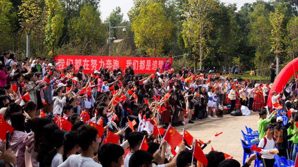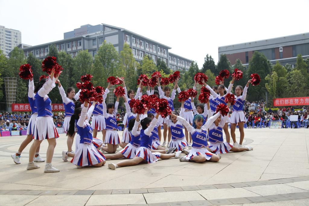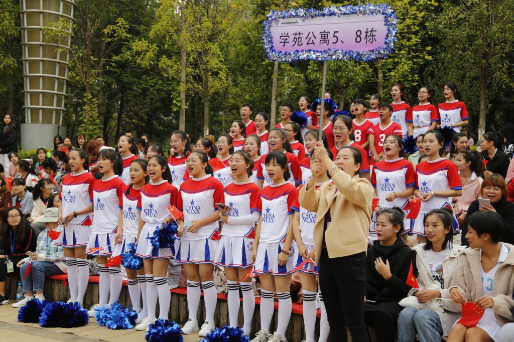 为了迎接伟大祖国的70华诞,比赛期间还有两个特别环节,各啦啦队方阵轮流喊出不同的爱国口号,表达对祖国的热爱,为祖国送上祝福;全体同学和老师起立合唱《我和我的祖国》,歌声洪亮富有感情,余声久久回荡于校园上空,同学们挥舞着手中的红旗,现场瞬间变成了红色的国旗海洋,展现了全体云师人对祖国的浓浓爱意与无限敬意。