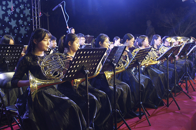 金秋时节,华灯初上,一曲浩荡的《红旗颂》打破了秋的凉意,点燃了广大师生的热情,《那些年我们追过的女孩》饱含深情,动听的旋律久久萦绕;风格迥异的《民歌联奏》与《阿拉丁》展现了民族特色和异域风情的不同魅力;熟悉的歌曲在耳畔响起,《黑猫警长》唤醒了我们的童年记忆;《雪花的快乐》回旋飘扬,优美的歌声让现场观众走进纯洁、飘逸、潇洒的世界;合唱曲目《大鱼》优美动听,如诗般的歌词直戳人心;《卡门组曲》、《单簧管波尔卡》和《龙舌兰》三首外国乐曲,时而幽默诙谐,时而跌宕起伏,时而高亢激昂,观众的情绪随着曲调的起伏不断变化;《知否知否》、《菊花台》和《卷珠帘》,古典的国风韵律,押韵的汉字填词,将现场气氛推到高潮;《老熊波尔卡》是一首交响乐中为数不多用大号进行独奏的曲子,反映了老熊憨态可掬的形象,曲调生动而有趣;《鹰的胜利》激情豪迈,自由、力量、勇猛在管乐团的演绎下表现的淋漓精致。音乐会在嘹亮的《我和我的祖国》中落下帷幕。本次音乐会,校艺术团用真挚的演绎衷心表达了对祖国70华诞的祝福,更展现了当代大学生的时代风貌。