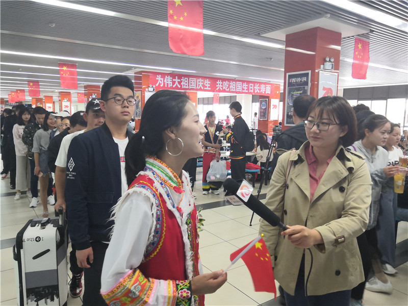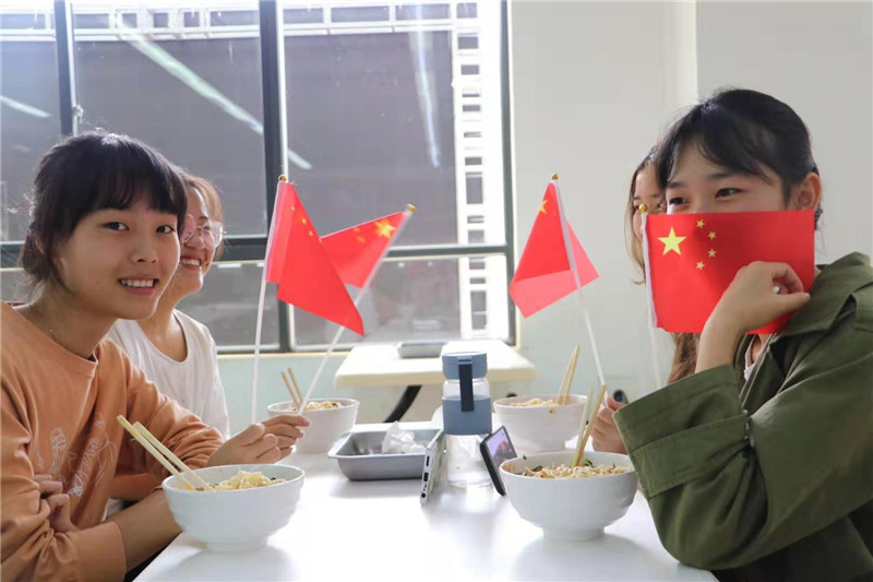 吃寿面、说变迁、话感受、道祝福。美术学院2019级美术设计的李佳同学谈到:“我们的祖国走过了70年,这70年里发生了许多的历史性时刻,高铁、移动支付等都让我深刻地感受到了祖国的强盛。我希望祖国能够越来越好,屹立世界。”
