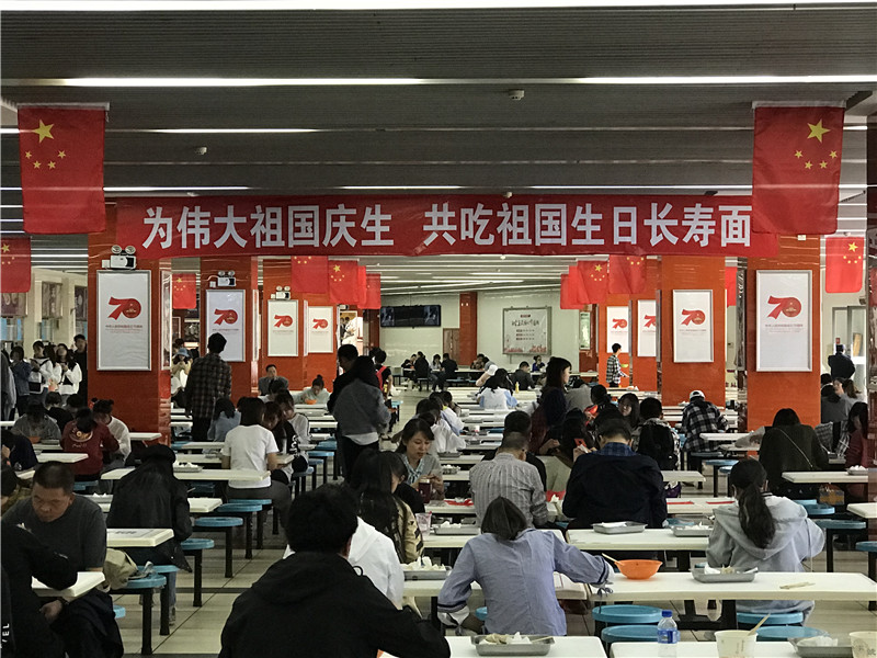 “红妆素裹”的食堂里,国旗飘扬,横幅高挂。食堂的工作人员们从早上7点便开始准备长寿面,静候师生们的到来。中午11点整,活动正式开始,工作人员们手脚麻利,煮面、盛面、加料,一气呵成,将一碗碗长寿面递到师生们手中。据统计,当天共有近万名师生相聚一堂,共享家国情,同吃长寿面,共同庆祝新中国成立70周年。