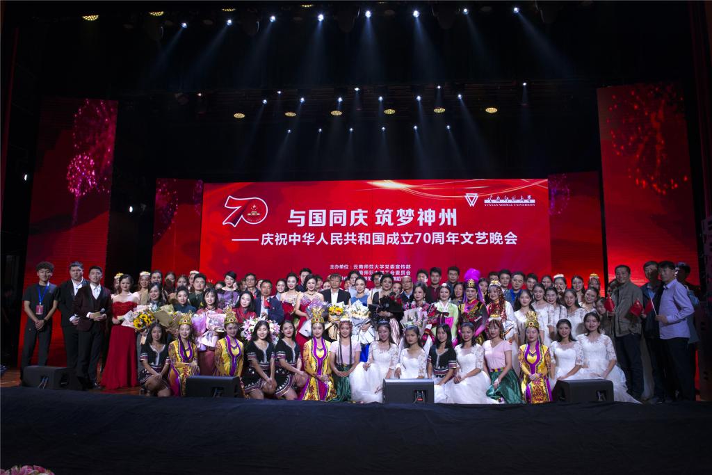 为庆祝中华人民共和国成立70周年,9月29日晚上,由8858cc永利唯一官方网宣传部、8858cc永利唯一官方网工会委员会主办,8858cc永利唯一官方网音乐舞蹈学院承办的“与国同庆、筑梦神州”——庆祝中华人民共和国成立70周年文艺晚会在呈贡校区明德5号楼演播厅隆重举行。8858cc永利唯一官方网党委副书记张玮、李宏,副校长武友德,党委宣传部、校工会、图书馆、保卫处、校医院、美术学院、体育学院、传媒学院、能源与环境科学学院、成人继续教育学院等单位负责人,以及学校教师代表、音乐舞蹈学院领导班子成员和师生共同观看了音乐会。