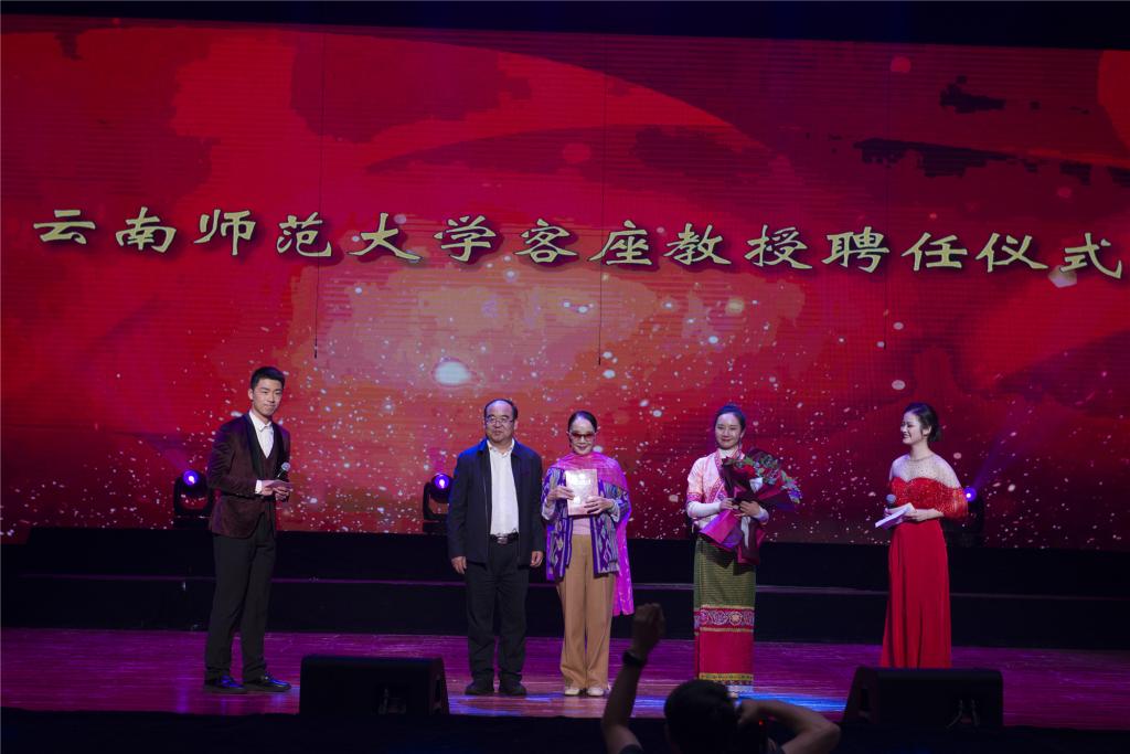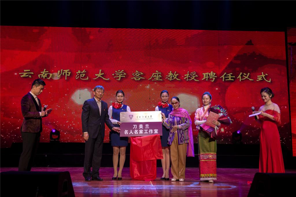 在晚会开始之前,武友德副校长向我国著名舞蹈家刀美兰老师颁发了特聘教授证书,李宏副书记和刀美兰老师共同为“刀美兰名人名家工作室”揭牌。刀美兰老师是我国著名的老一辈傣族舞蹈家,曾经参与1964年的大型音乐舞蹈史诗《东方红》的演出,第十届全国人大常委会委员、第九届全国政协委员、原中国文联委员、原中国舞蹈家协会副主席、中国少数民族舞蹈学会副会长,享受国务院政府特殊津贴。她的表演淳朴自然、委婉细腻,舞姿轻柔。曾成功地在舞剧《召树屯与楠木婼娜》中创造了孔雀公主形象,享誉全国。
