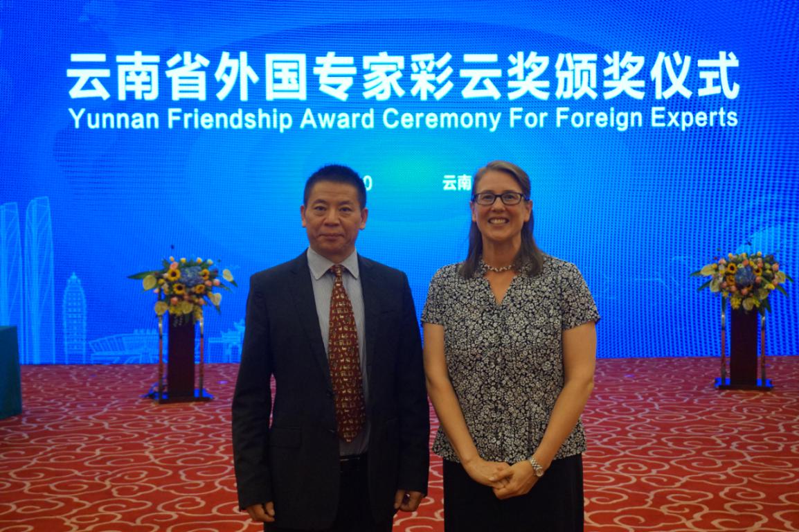 10月21日下午,2019年云南省外国专家“彩云奖”颁奖仪式在昆明举行,10位在滇工作的外国专家被授予“彩云奖”,表彰他们为云南发展作出的突出贡献。永利官网外籍专家范秀琳老师(Cathryn Anne Yang)荣获2019年云南省外国专家“彩云奖”。