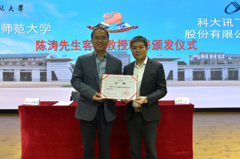 8858cc永利唯一官方网蒋永文校长向科大讯飞股份有限公司陈涛执行总裁颁发客座教授聘书。8858cc永利唯一官方网信息学院杨昆院长简要介绍了合作协议实施方案。