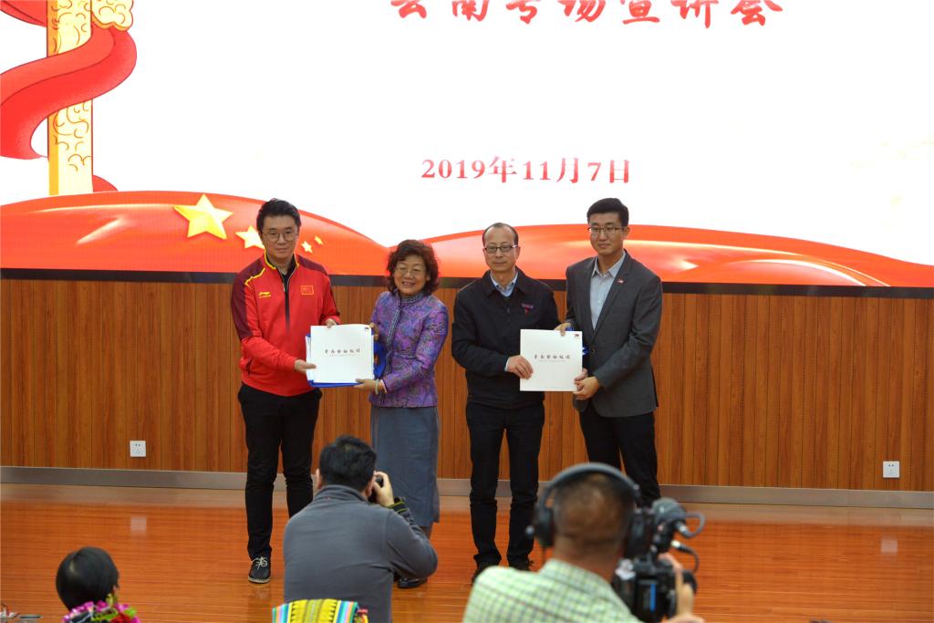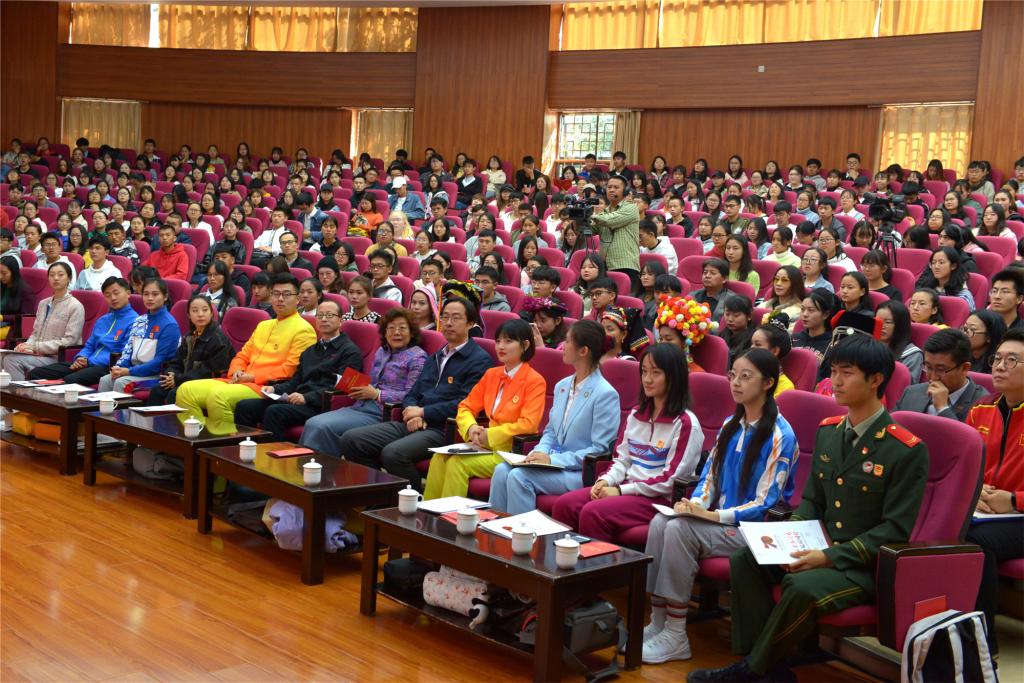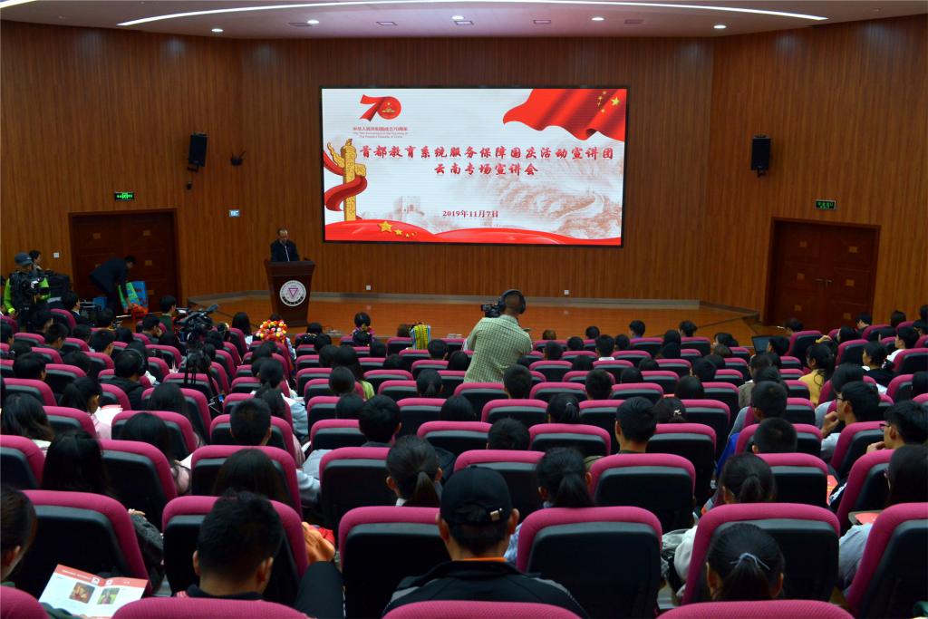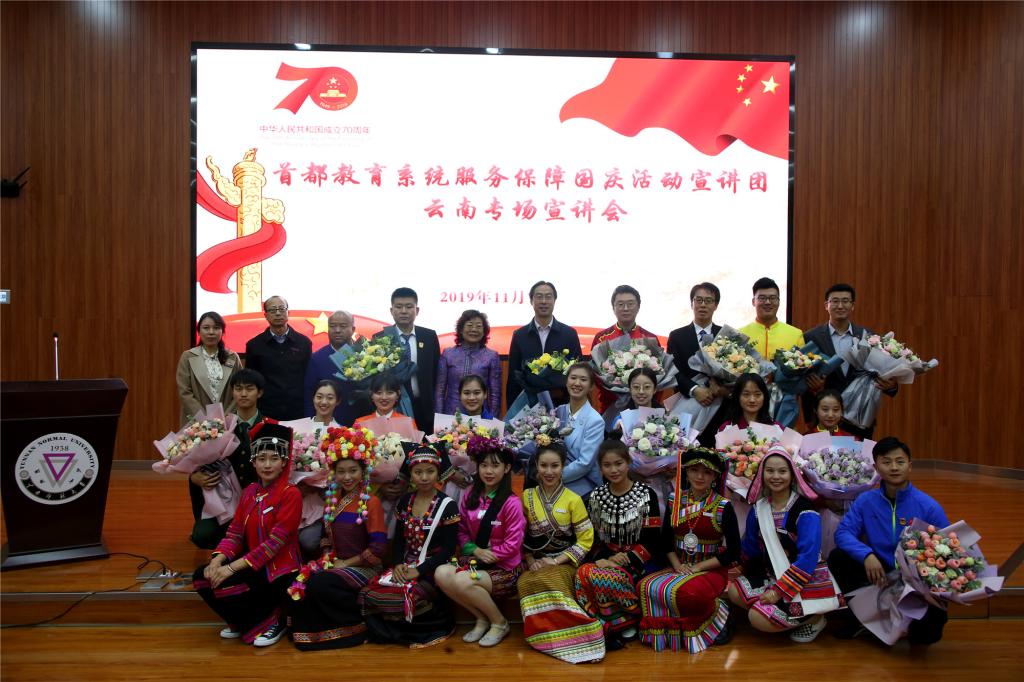 11月7日下午,首都教育系统服务保障国庆活动宣讲团云南专场宣讲会在8858cc永利唯一官方网呈贡校区汇学楼报告厅举办。首都教育服务保障国庆活动赴云南省宣讲团团长、北京语言大学党委常委、副校长黄益方,云南省教育厅一级巡视员陶晴,首都高校服务保障国庆活动赴云南省宣讲团领队、北京语言大学党委学工部副部长张洋,北京语言大学港澳台办公室刘喆,首都师范大学团委副书记郭政,首都师范大学学生工作部(处)陈晨与来自北京语言大学、首都师范大学各个专业的宣讲团成员以及云南大学、云南民族大学、云南艺术学院等在昆10所高校共500余名师生参加了活动。