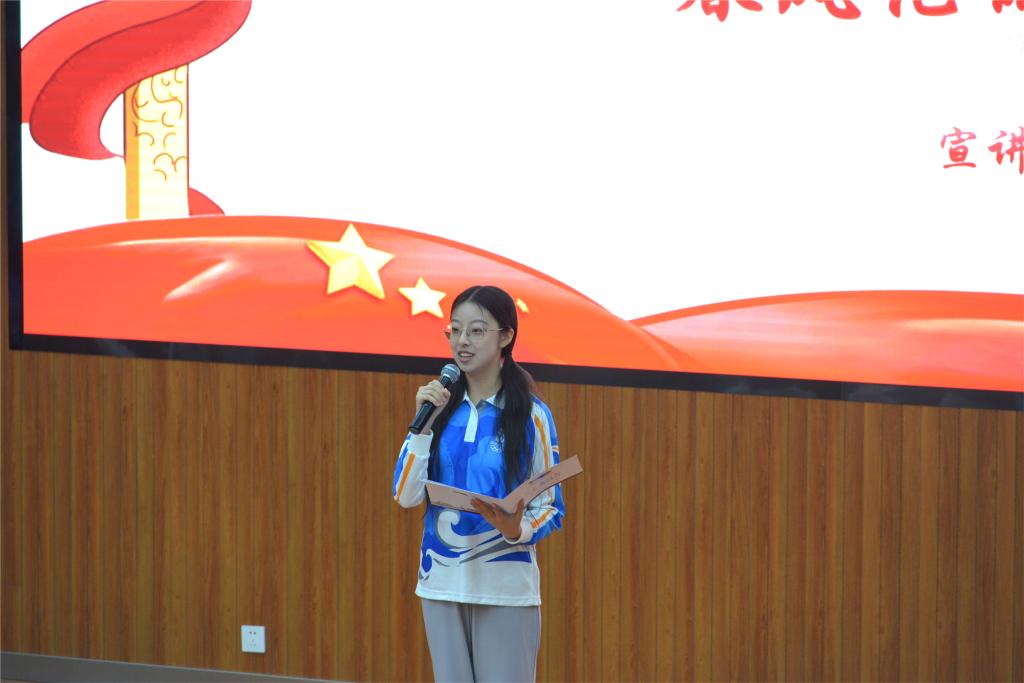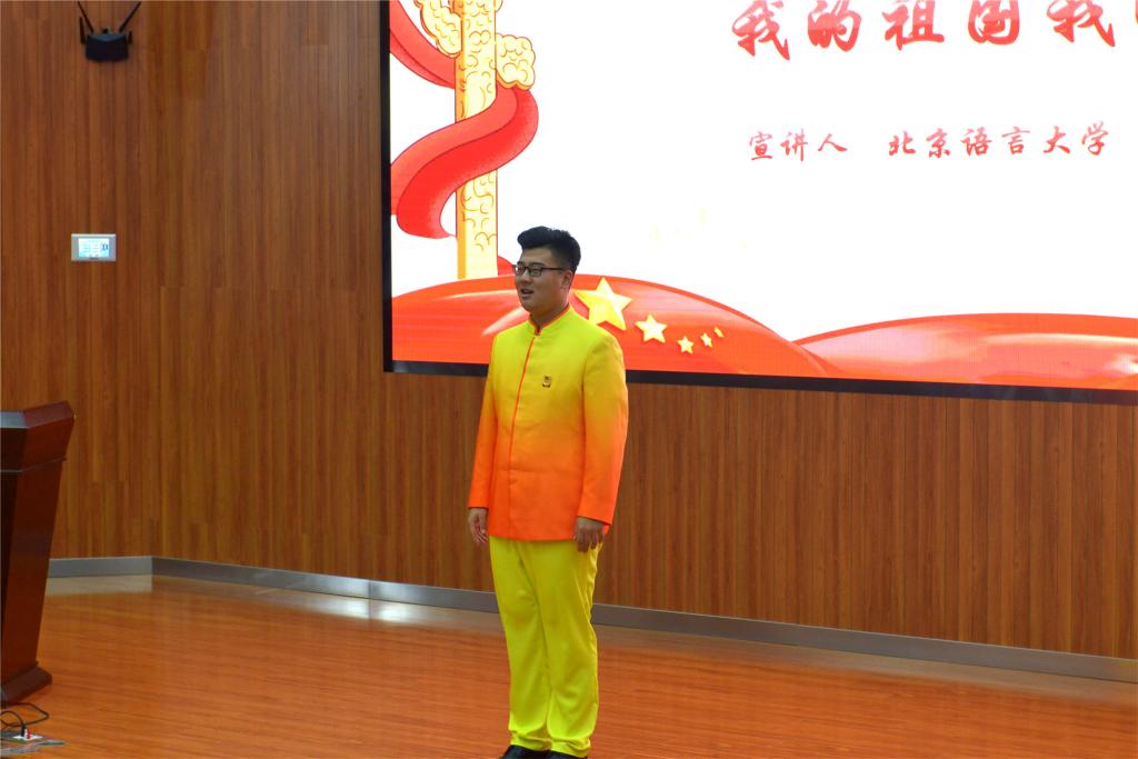 随后,宣讲团10位成员先后作了精彩的演讲,分享了他们在为国庆活动准备过程中的切身感受。来自首都师范大学外国语学院的张致远是退伍大学生和国庆群众游行“跨越世纪”方阵队列教练,他以《爱国是一场生动的实践》为题,讲述了在国庆活动中,士兵矢志不渝的爱国情怀、学子不忘初心的强国之志;来自北京语言大学商学院的唐诗琪以《爱国情怀无需多言,春风化雨浸润心田》为题进行宣讲,阐释了爱国主义教育无需多言,爱国是刻在每个人骨血里的,无论何时都不会被磨灭的情感;来自首都师范大学政法学院的刘鉴翔以《家·国》为题,讲述了“因爱家,所以饱含深情;因爱国,所以充满力量”的内心感受;来自北京语言大学外国语学部英语学院的刘诗朗作为在京读书的香港学子,怀饮水思源之心,以《我属于中国》为题展开演讲,用信念和热诚展现出了同胞青春活泼的朝气;来自首都师范大学音乐学院的丁超男是国庆广场合唱分指挥之一,她以《天安门前的21个背影》为题,生动讲述了她坚持指挥训练中付出的辛劳和收获的喜悦,她感慨:“挥舞手臂,仰望国旗,一次受阅,终身荣耀,砥砺追梦,不负韶华”;来自北京语言大学艺术学院的高子严以《我的祖国我的歌》为题,讲述了用青春和歌声向祖国致敬的故事,并在最后带领全场一同唱响了“我和我的祖国,一刻也不能分割”;“在我心里,三个月的集训时间每一秒都值得被铭记,每一份付出都值得被肯定”,来自首都师范大学文学院的陈琛以《每一秒都值得被铭记》为题,与大家分享了健美操运动员光鲜亮丽背后的千锤百炼; “再小的螺丝钉都有它的作用,它会在需要它的地方发光发热”,来自北京语言大学语言科学院的庞镕榕作为志愿者领队,以《每一个你都无比珍贵》为题,向大家阐释了平凡的志愿者不平凡的奉献;来自首都师范大学音乐学院舞蹈系的杨贤将大学生退伍士兵的刚毅、勇敢、作战状态等形象融入到自己的舞蹈专业之中,为全国武警战士文艺汇演创作了优秀的剧目。他以《祖国,我向您报到》为题讲述以青春之我、奋斗之我报效祖国的情怀;来自北京语言大学人文社会科学学部新闻传播学院的李木子在群众游行“圆梦奥运”方阵中担任了第一排把控队伍中线的重任,她以《为了你,一切都是值得》为题,表达了用青春的力量奉献祖国美好未来的初心。