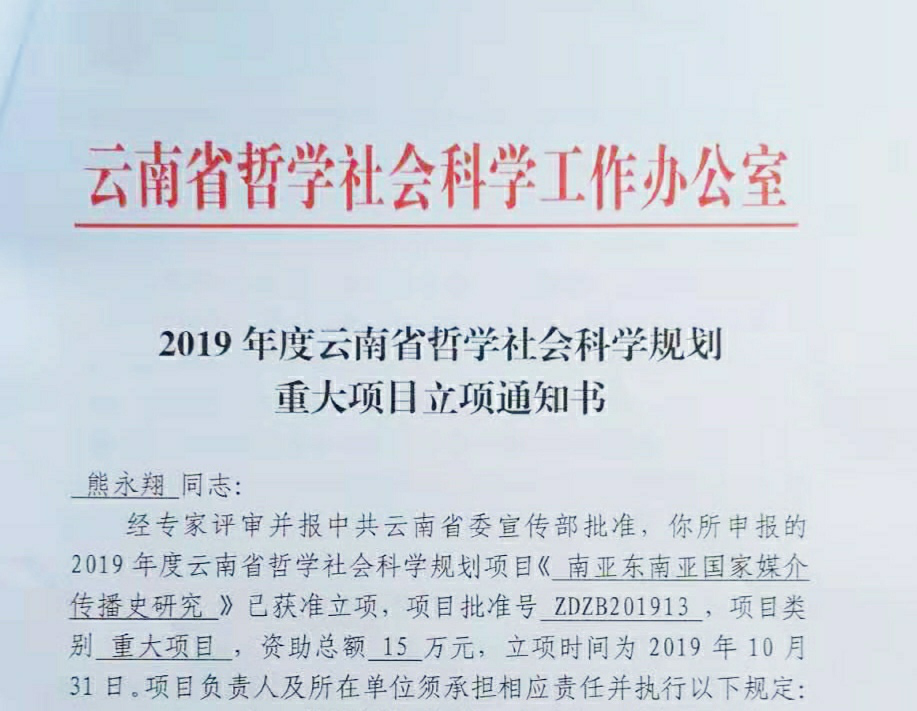 近日,中共云南省委宣传部公告了2019年度云南省哲学社会科学规划重大项目、重点项目立项名单。在所立项的13项重大项目中,永利官网安学斌教授领衔的“新中国70年云南民族文化保护传承发展研究”和传媒学院申报的“南亚东南亚媒介传播史研究”获准立项研究。