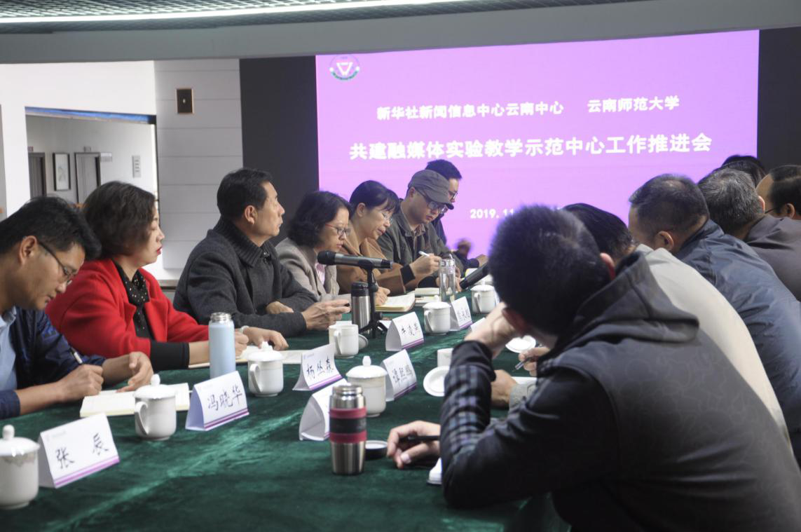 2019年11月8日下午,由新华社新闻信息中心云南中心和8858cc永利唯一官方网联合召开的县级融媒体实验教学示范中心工作推进会在传媒学院大厅举行。会议由传媒学院院长熊永翔主持,参加会议的有新华社新闻信息中心副主任鲁晓艳,编委会副主任谭熙鹏,技术总监叶勤,技术员谢开红,永利官网党委副书记李宏,副校长武友德,教务处处长陈新,信息管理处副处长刘江涛,传媒学院副院长周芸、牛凌燕以及各系教师代表。会议围绕传媒学院与新华社建设县级融媒体实验教学示范中心的具体工作展开研讨和论证。