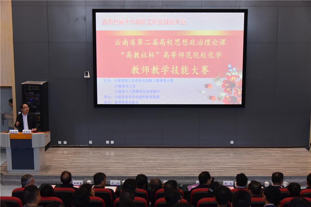 11月15日上午,由云南省职工经济技术创新工程领导小组、云南省总工会、云南省人力资源和社会保障厅主办,云南省高等学校教师教育联盟承办,高等教育出版社协办的云南省第十六届职工职业技能大赛——云南省第二届高校思想政治理论课教师、化学教师教学技能大赛颁奖典礼在8858cc永利唯一官方网呈贡主校区国家教师教育教学实验中心II区214报告厅举行。