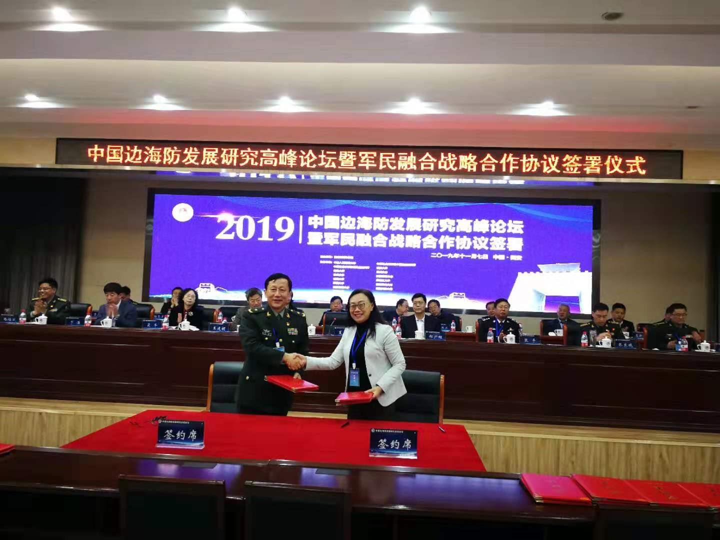 在两校前期合作的基础上,并基于前期沟通达成的合作意向,会前举行了军民融合战略合作协议签约仪式。郝淑美副校长代表学校与陆军边海防学院政委夏阳将军签署了校际战略合作协议,为双方进一步开展深度合作构建了良好机制。