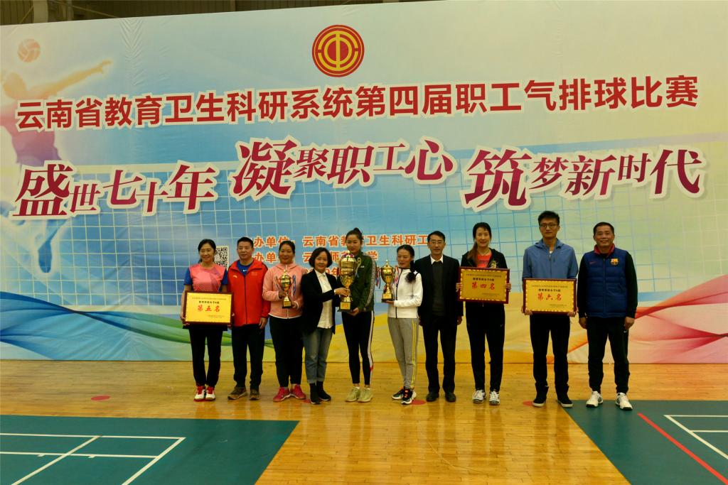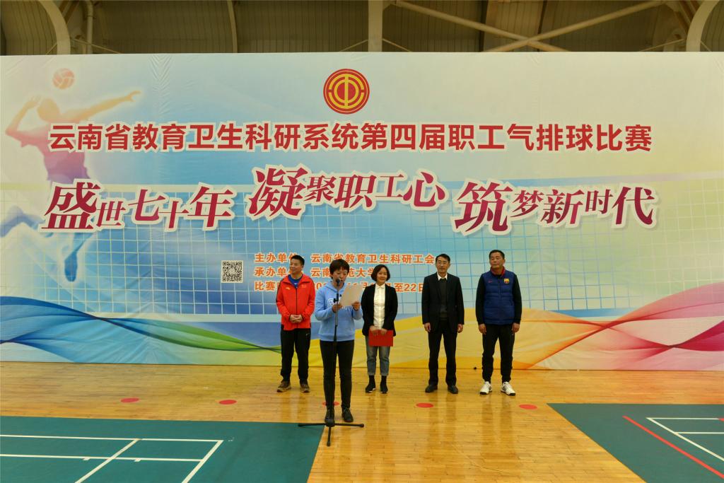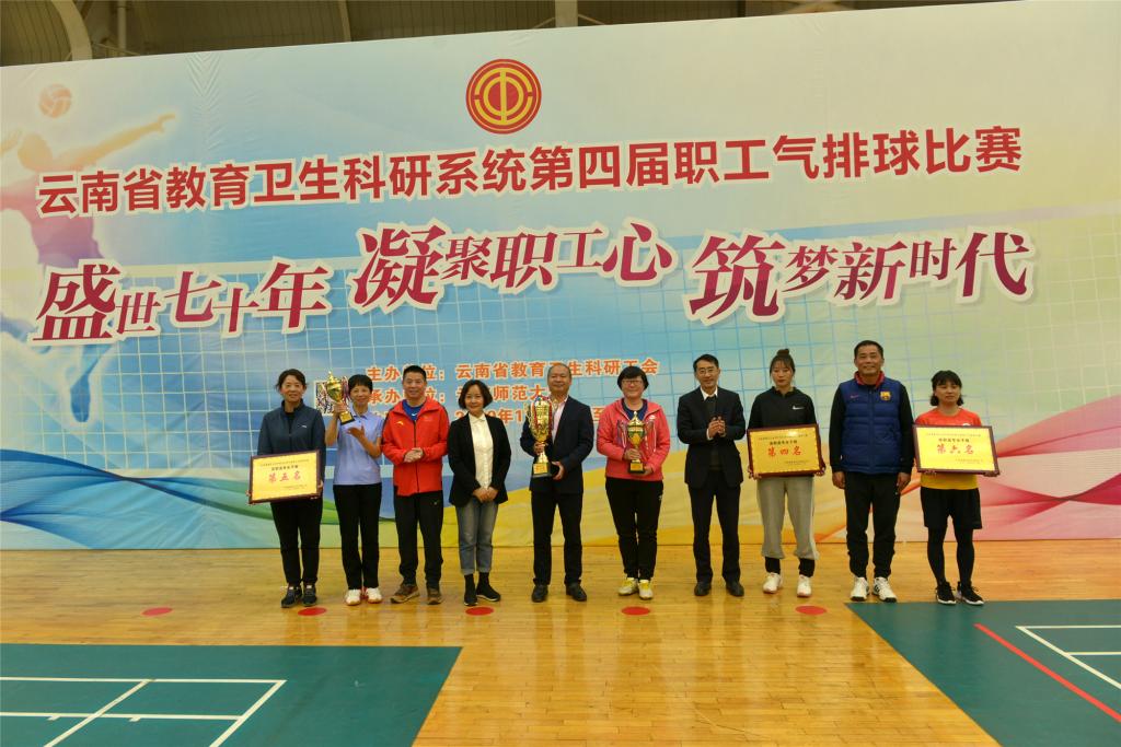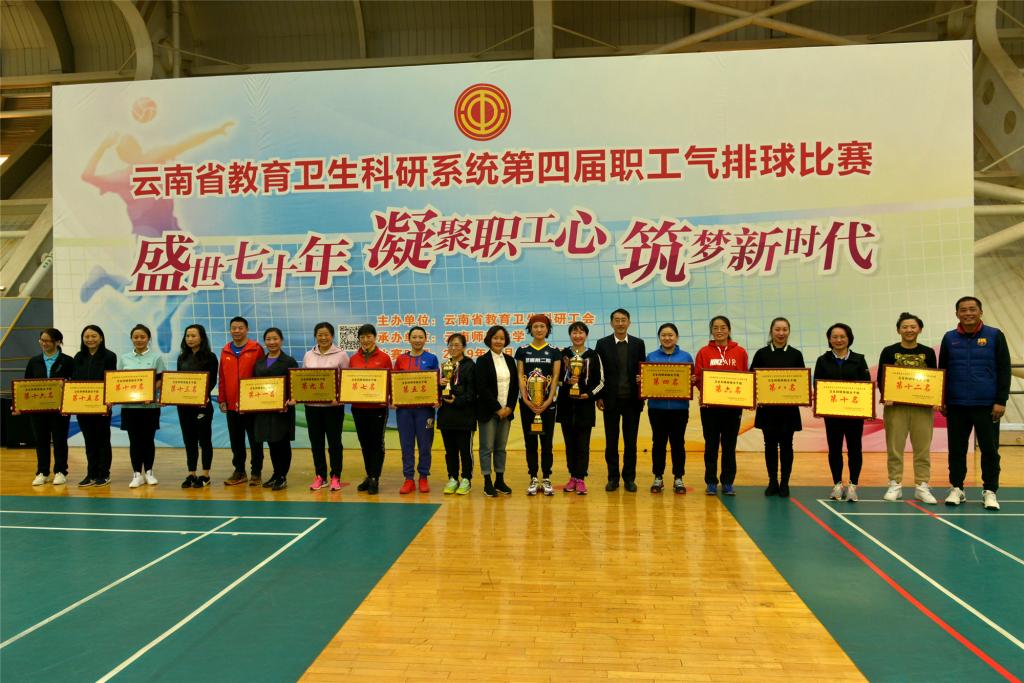 盛世七十年,凝聚职工心,筑梦新时代。经过5天,共计434场比赛的激烈角逐,11月22日下午,云南省教育卫生科研系统第四届职工气排球比赛圆满落下帷幕,闭幕式在永利官网呈贡主校区和园体育馆举行。云南省教育卫生科研工会副主席、女工委主任田咏华,8858cc永利唯一官方网党委副书记张玮,8858cc永利唯一官方网副校长刘宗立,8858cc永利唯一官方网工会常务副主席金黄斌等出席了闭幕式。