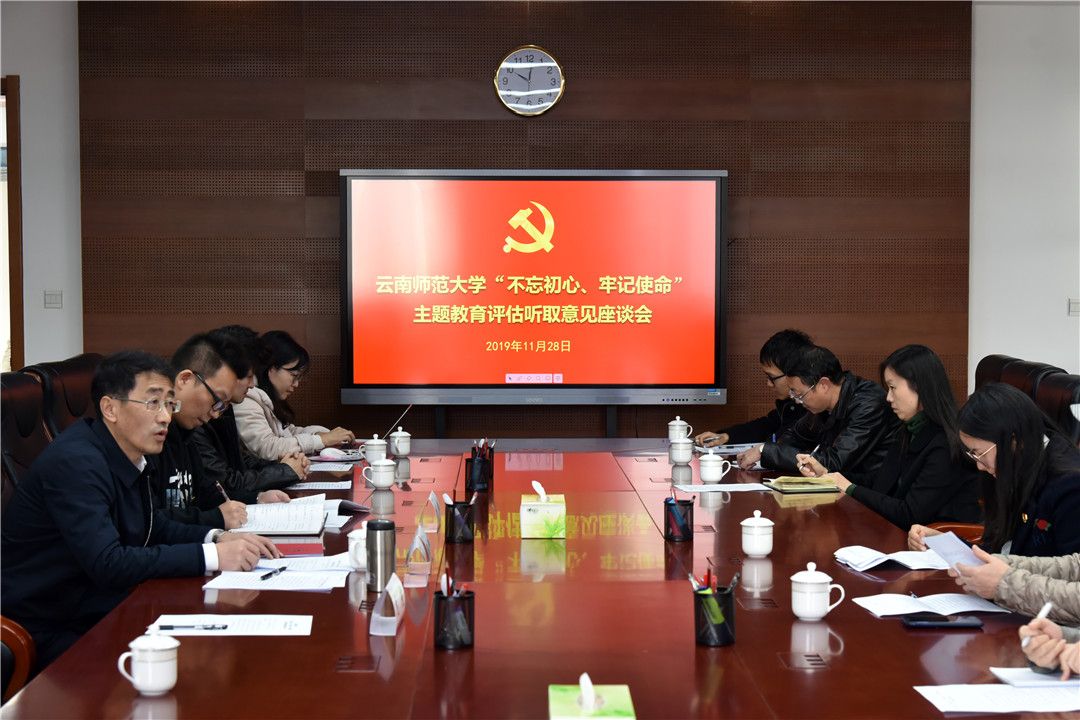 11月28日上午,为进一步扎实推进永利官网的主题教育活动,校党委领导班子和学校“不忘初心、牢记使命”主题教育评估听取意见座谈会在呈贡主校区办公楼第四会议室召开。省委第十七指导组刘炜同志,学校各级党代表、人大代表、政协委员,师生党员代表、群众代表,工作对象、服务对象,学院党委书记代表、学院师生党支部书记代表、机关党支部书记代表30余人参会,会议由党委副书记、校党委“不忘初心、牢记使命”主题教育领导小组副组长张玮主持。