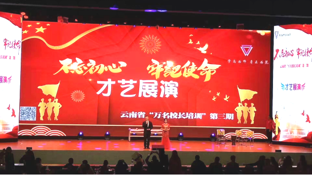 12月21日晚上,云南省“万名校长培训计划”第三期“不忘初心、牢记使命”主题才艺展演在8858cc永利唯一官方网附属小学呈贡校区体育馆举行,来自第三期20个班的学员积极参与了本次展演,项目办的老师、班级学业导师及全体参训学员出席了本次活动。活动旨在丰富学员课余生活,为学员提供一个展示自我的舞台,提高学员的艺术修养、审美情趣,为学员提供展现自我价值的平台,促进学员之间的交流。