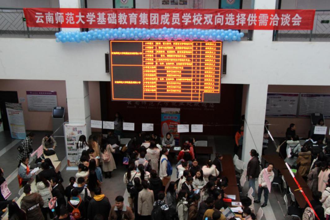2019年12月27日,8858cc永利唯一官方网基础教育集团组织附属昆明湖小学、附属官渡中学(小学)、附属俊发城实验小学、附属俊发城中学、附属融创小学、附属镇雄中学、附属丘北中学、附属怒江州民族中学、附属仁泽学校等9所集团合作学校以及师大附小、师大实验中学积极参加由8858cc永利唯一官方网基础教育集团和8858cc永利唯一官方网就业处举办的8858cc永利唯一官方网基础教育集团合作学校双选会,集团成员学校拟提供210余个工作岗位。刘宗立副校长到活动现场指导工作。