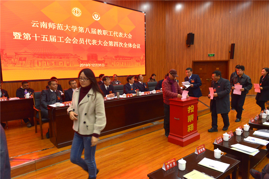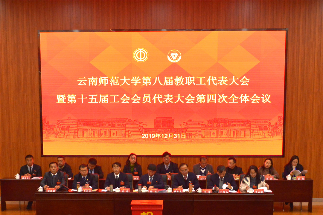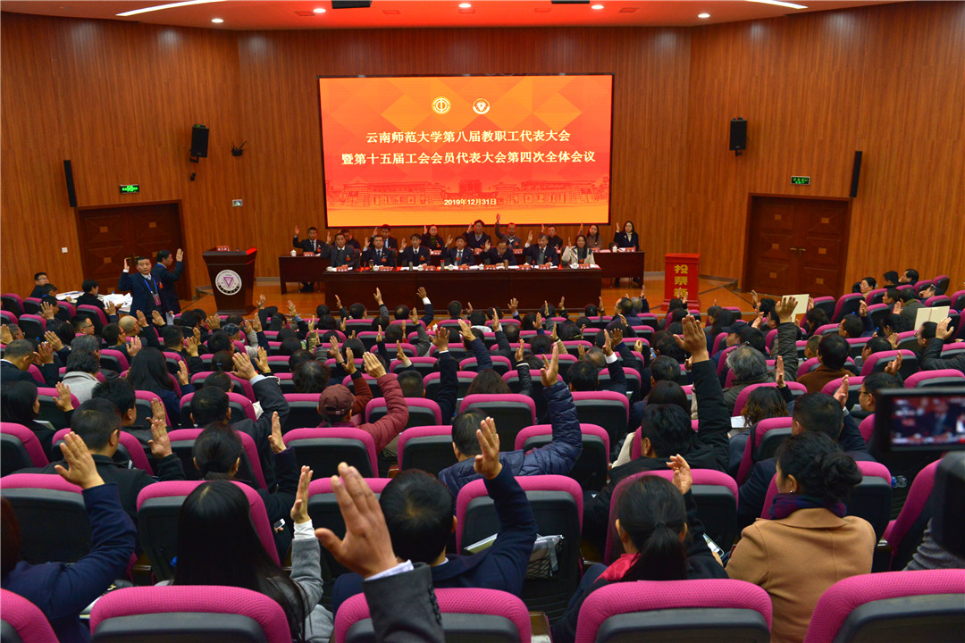 校党委饶卫书记作大会总结讲话。饶书记指出,此次大会的召开充分体现了广大教职工“当好主人翁、建功新时代”,积极投身学校改革建设发展事业的良好精神面貌,实现了统一思想、振奋精神、建言献策、深化改革的目标,为学校加快推进教师教育为特色的高水平大学建设营造了良好氛围。饶书记就进一步加强党的政治建设,确保各项改革平稳有序推进和落实提出了四点要求:一是要贯彻新时代党的建设总要求,始终把政治建设摆在首位,推动党的各方面建设全面进步全面过硬;二是要切实提高政治站位,深入学习贯彻党的十九届四中全会、省委十届九次全会精神;三是要加强对学分制改革、岗位聘用制改革工作的领导,确保改革目标实现;四是各级工会、教代会要不忘初心、牢记使命,不断提升履职能力。饶书记号召,全校广大教职工要紧密团结在以习近平同志为核心的党中央周围,始终不忘党的初心、永远牢记党的使命,大力弘扬“跨越发展、争创一流;比学赶超、奋勇争先”精神,在学校党委的领导下,弘扬传统、改革创新、勇于担当,加快推进教师教育为特色的高水平大学建设,不断提升服务云南“三个定位”和打好世界一流“三张牌”的能力,为实现云南教育现代化、全面建成小康社会做出新的更大贡献。8858cc永利唯一官方网第八届教职工代表大会暨第十五届工会会员代表大会第四次全体会议在雄壮的《国际歌》声中圆满落下帷幕。