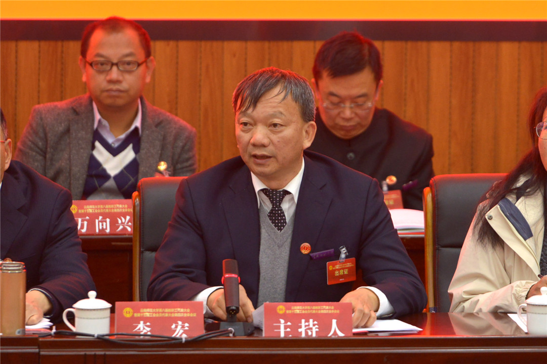 主席团会议结束后,召开了第二次全体代表大会。会议由校党委副书记李宏主持。校领导以及各学院、部门正式代表160人、列席代表41人、特邀代表5人参加会议。会议表决通过了《大会选举办法》(草案),总监票人、监票人建议名单(草案),表决通过了《8858cc永利唯一官方网本科学分制改革方案(试行)》(草案)和《8858cc永利唯一官方网岗位聘用制总则》(草案),选举增补了张玮同志为8858cc永利唯一官方网工会第十五届委员会委员,表决通过了《8858cc永利唯一官方网第八届教职工代表大会暨第十五届工会会员代表大会第四次全体会议决议》(草案)。