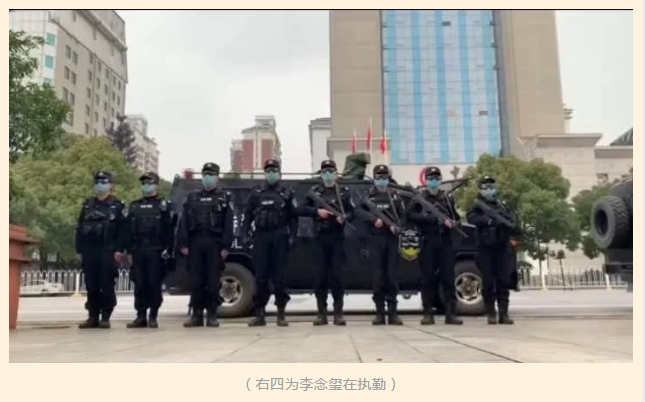李念玺毕业后便考入公安系统,2019年正式进入特警支队,此后一直在黄石市忙于公安工作。年底时按照单位的人性化规定,外省民警优先休假,但突如其来的疫情打破了他与亲人的团聚时光。2020年1月28日,正月初四,此时湖北疫情已经进入爆发时期,李念玺接到重返岗位的通知,没有任何迟疑,放下与家人团聚的喜悦,便紧急返回黄石。1月30日,李念玺正式投身于黄石市的抗疫工作中。“逆行是我们人民警察最标准的姿态,疫情当前,警察不退!”从穿上警服的那一刻,他始终牢记为人民服务的初心和使命,在抗击新冠肺炎疫情面前,做到守土有责,一步不退。他说:“家人的不舍与担心我也只能放在心里,身为一名共产党员以及一名公务员,当国家和人民需要之时,我理应有召必回”。就这样,李念玺毅然走上抗疫一线。