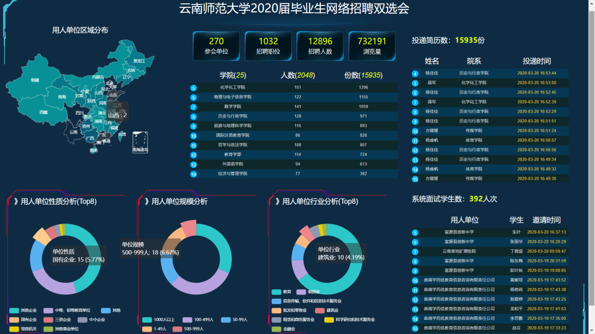 截止3月20日17时,共有8203名来自全国300余所高校的毕业生参会,其中本校学生2044人,总投递简历54363人次,其中本校学生投递简历15935次,通过系统面试邀约139人次,网络签约60人次。