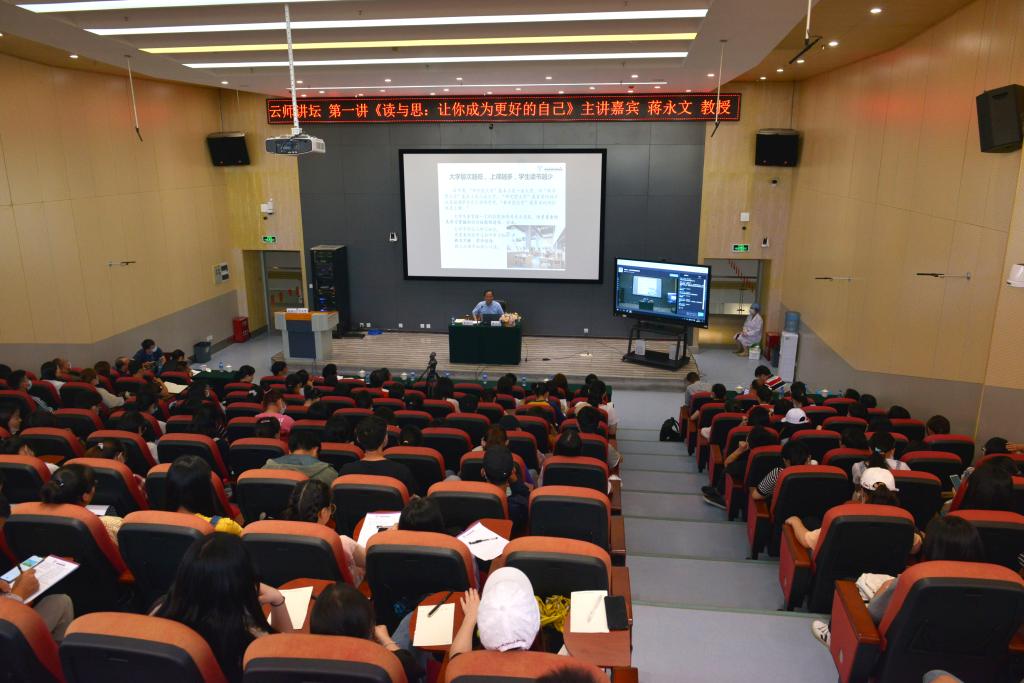 6月12日晚,“云师讲坛”第一讲如期举行。8858cc永利唯一官方网校长蒋永文教授受邀担任开讲嘉宾,为永利官网师生带来题为《读与思:让你成为更好的自己》的讲座。讲座由副校长武友德教授主持,承办讲坛的校党委宣传部、校团委、科研处、学生处、就业处、信息处、教务处等职能部门负责人,与150余名学生一起现场聆听讲座。