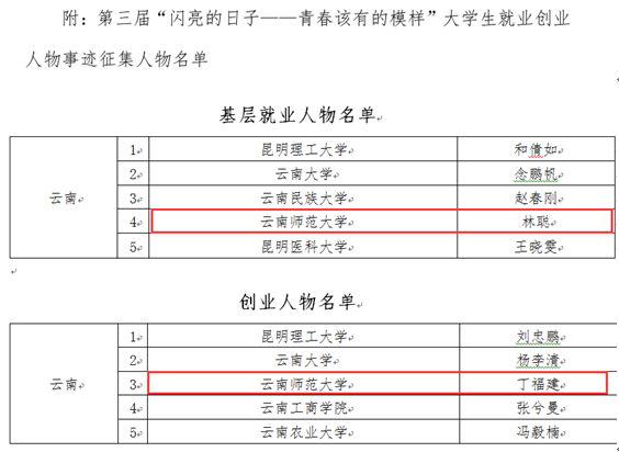 “闪亮的日子—青春该有的模样”大学生就业创业人物事迹征集活动分为校级选拔、省级推荐、国家级评选三个阶段。为发挥榜样引领作用,今年活动启动以来,就业处积极配合云南省大中专毕业生就业指导与服务中心推进具体工作,通过开展宣传动员、招募评审和材料优化等系列工作,充分发掘近几年在基层就业、大学生创业和军营大学生战士等领域就业的大学生就业典型事例,确保了推荐人选的代表性和事迹材料的生动性。本次毕业生入选,不但向社会展示了师大学子的良好形象,发挥了示范典型的引领作用,也彰显了永利官网就业创业的成果和特色,体现了毕业生更高质量和更充分就业,推动建设以教师教育为特色的高水平大学。