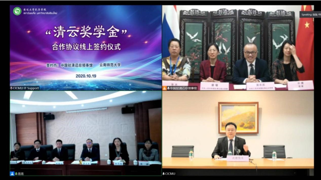 2020年10月19日上午,永利官网与中国驻清迈总领事馆“清云奖学金”合作协议线上签约仪式在呈贡主校区行政楼340会议室举行。中华人民共和国驻清迈总领事馆吴志武总领事、潘谨副总领事、许倩主任、张杰领事,8858cc永利唯一官方网校长蒋永文、副校长刘宗立、云南华文学院党委书记和雪莲、院长王秀成以及对外合作交流处、华文学院、清迈孔子学院主要负责人参加了此次签约仪式。签约仪式由刘宗立副校长主持。