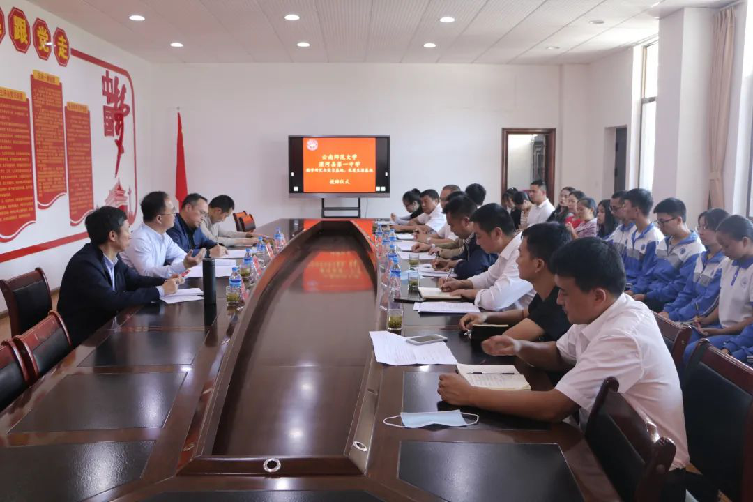 11月6日下午,蒋永文校长一行到梁河一中调研并出席“8858cc永利唯一官方网教学研究实习与就业基地”签约暨揭牌仪式,梁河县委常委陈元邦、梁河县人民政府副县长景智富、梁河县教育体育局局长赵光耀、梁河县一中党总支书记、校长寸永勐以及学生代表出席揭牌仪式。随后,蒋永文校长为梁河一中“8858cc永利唯一官方网教学研究与实习就业基地”“8858cc永利唯一官方网优质生源基地”授牌,并与梁河县相关领导、梁河一中师生代表进行座谈。在座谈会上,赵光耀局长代表梁河县教体系统对8858cc永利唯一官方网精准扶贫帮扶梁河教育取得显著成效表示感谢;寸永勐校长介绍了梁河一中的有关情况,并表示,此次基地落成,必将促进梁河一中持续稳健发展,梁河一中将倍加珍惜、勤奋工作、不负众望。