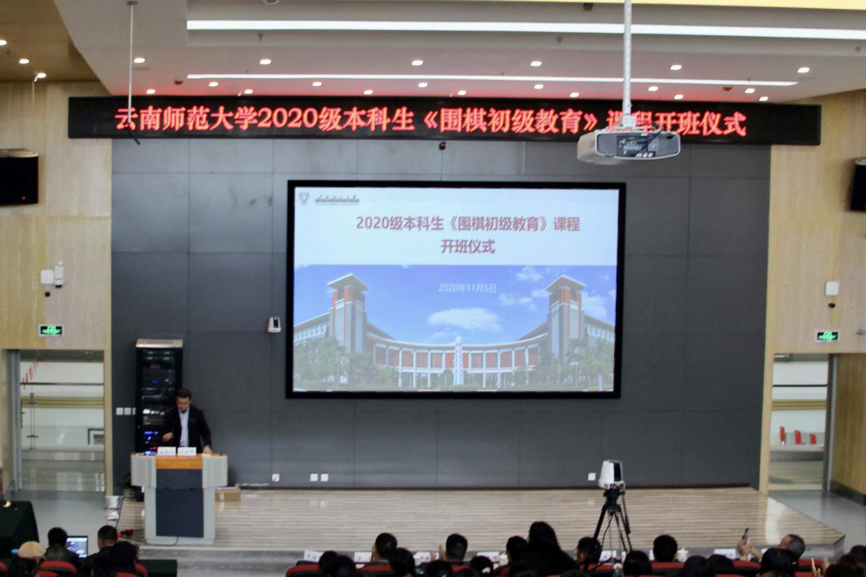 11月5日下午,8858cc永利唯一官方网2020级本科生《围棋初级教育》课程开班仪式在呈贡校区国家教师教育教学实验示范中心举行。全国政协第十届、十一届常委、云南省政协原副主席曾华,省教育厅体卫艺处处长徐忠祥,云南省围棋协会主席陆军,云南省围棋协会副主席、省学生体育协会围棋专业委员会主任王东旭,云南省围棋队总教练邱继红,云南籍唯一九段棋手丁伟,8858cc永利唯一官方网副校长牛治亮、武友德,相关职能部门领导,《围棋初级教育》课程授课老师及学生代表参加开班仪式,开班仪式由牛治亮副校长主持。