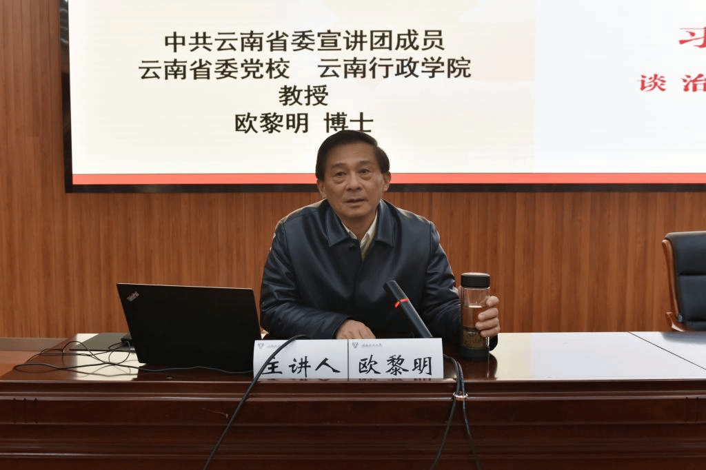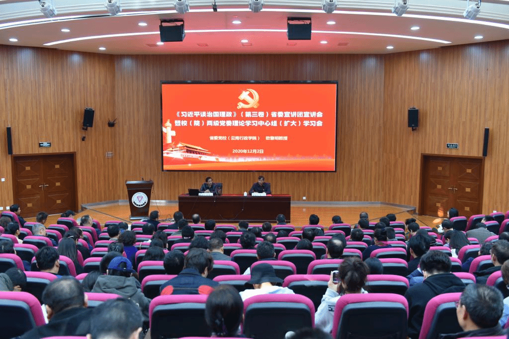 为认真学习宣传《习近平谈治国理政》第三卷,把学习宣传贯彻习近平新时代中国特色社会主义思想和习近平总书记考察云南重要讲话精神不断引向深入,引导师生读原著、学原文、悟原理,12月2日,永利官网于呈贡校区汇学二号楼报告厅举行《习近平谈治国理政》第三卷省委宣讲团宣讲会暨校(院)两级党委理论学习中心组(扩大)学习会。省委宣讲团成员、省委党校(云南行政学院)原副校(院)长欧黎明教授应邀作主题宣讲,宣讲会由校党委副书记李宏主持。全体校领导、全校副处级及以上领导干部、思政课教师、部分教师和学生代表参加了宣讲会。