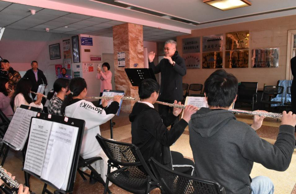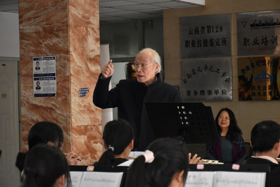 于海先生与职业技术教育学院同学们合奏了一曲高昂的《勇往直前》,卞祖善先生也耐心对学生们进行指导。两位老艺术家循循善诱、严谨认真,带领同学们从细节入手,纠正他们在演奏时常犯的错误,同学们均表示受益匪浅,最终完成了一首精准流畅的《茉莉花》演奏。