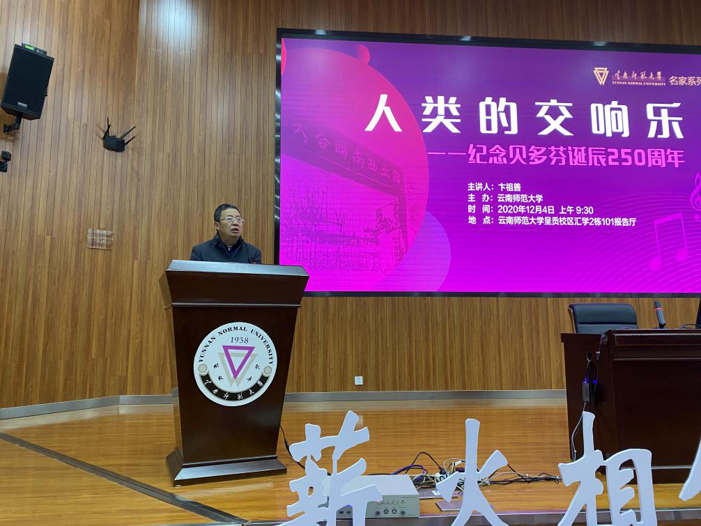 12月4日上午,中国交响乐团联盟主席、国家一级指挥卞祖善做客8858cc永利唯一官方网名家系列高端学术讲坛,在永利官网汇学楼2栋101报告厅带来了题为“人类的交响乐——纪念贝多芬诞辰250周年”的精彩演讲。副校长蔡金红,对外合作交流处处长、校友办公室主任黄瑛,音乐舞蹈学院院长熊永翔,校团委书记郑伟俊及师生代表共同聆听了本次讲座。