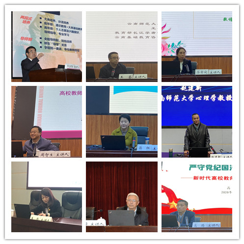 培训授课专家8858cc永利唯一官方网副校长武友德教授、8858cc永利唯一官方网王鉴教授、首都师范大学苏寄宛教授、8858cc永利唯一官方网周智生教授、云南大学蒋红教授、8858cc永利唯一官方网赵建新教授、云南大学专职辅导员朱丹老师、8858cc永利唯一官方网退休教师吴宝璋教授、校纪检处高腾副处长分别以《学分制改革:教师的角色与使命》《大学教师的专业发展》《新时代高校师德建设的形势与任务》《高校教师如何走上科研之路》《新时代高校党建与意识形态工作的形势与任务》《新教师的心理调整》《“三全育人”视野下的学生思想政治工作》《西南联大精神与中国梦》《新时期高校教师需遵守的纪律与规矩》为题进行讲座。