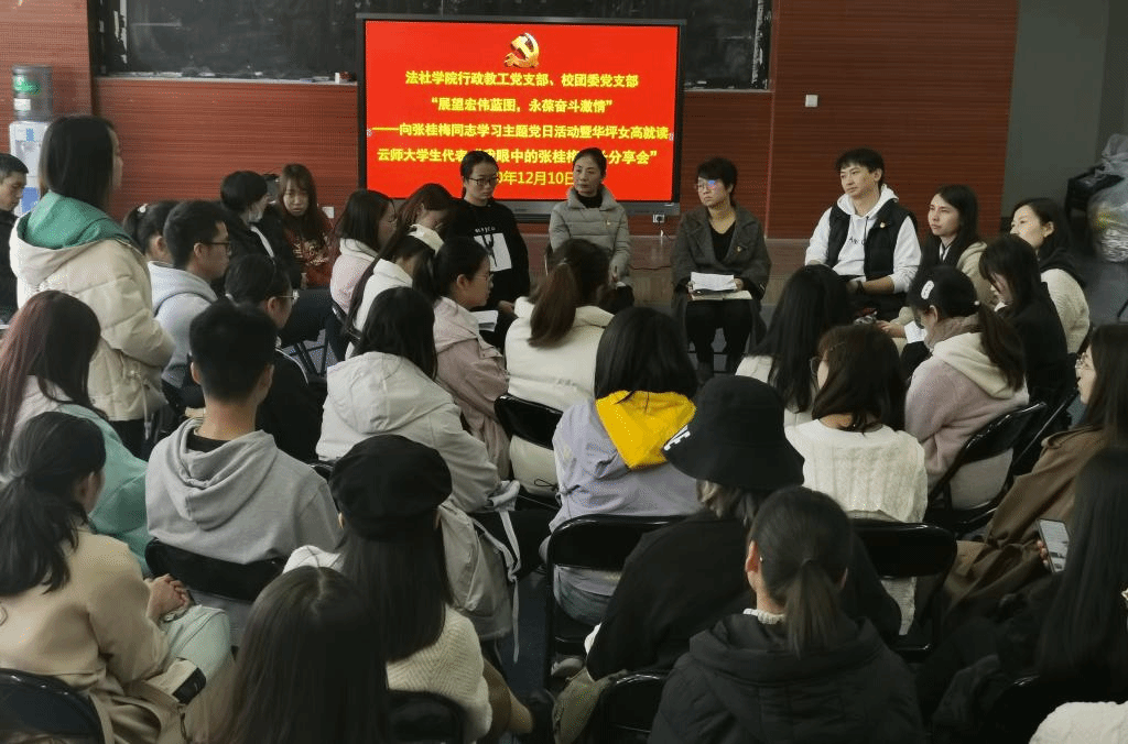 2020年12月10日下午,法社学院行政党支部、校团委党支部、各学院(部)团委书记、华坪女高就读永利官网31名学生代表,在呈贡校区大学生活动中心301室开展“展望宏伟蓝图,永葆奋斗激情”——向张桂梅同志学习主题党日活动暨华坪女高就读云师大学生代表“我眼中的张桂梅校长”分享会。