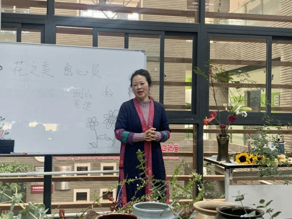 本次活动特邀生命科学学院桑林副教授进行园艺插花指导,在活动中桑老师从插花艺术要领、东西方插花的特点与欣赏、东方传统插花艺术的风格等方面做了讲解,并现场进行插花演示。各位老师和同学在桑老师的指导下进行作品创作,体验插花活动的乐趣,整个体验活动在愉快欢乐的氛围中进行。