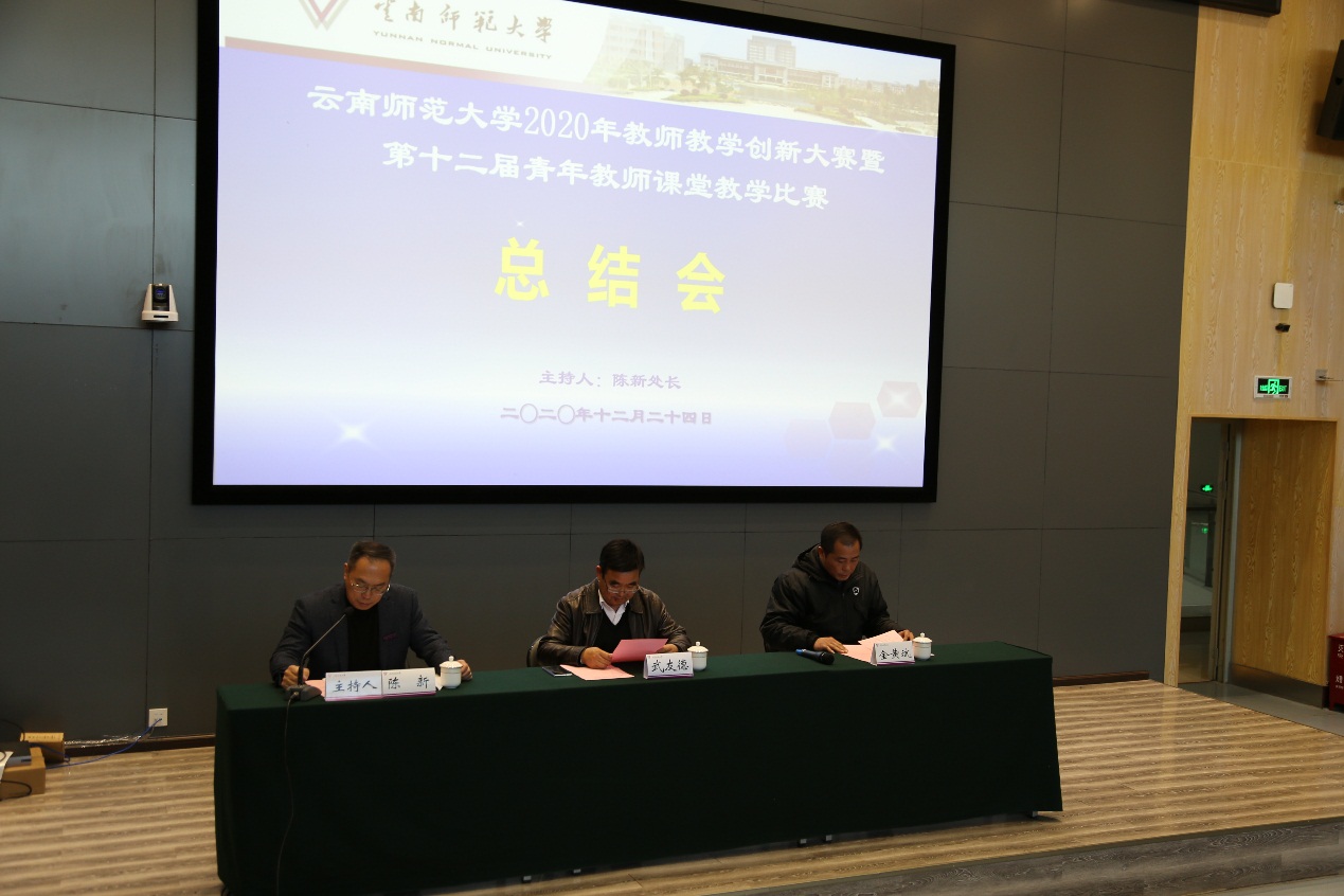 赛后的总结会由教务处陈新处长主持。评审专家李天凤教授代表评审委员会对参赛老师的表现做了精彩的点评,并提出需要改进的意见和建议。教育学部杨斌老师代表参赛教师做了发言,校工会金黄斌常务副主席宣布了获奖名单并总结发言。