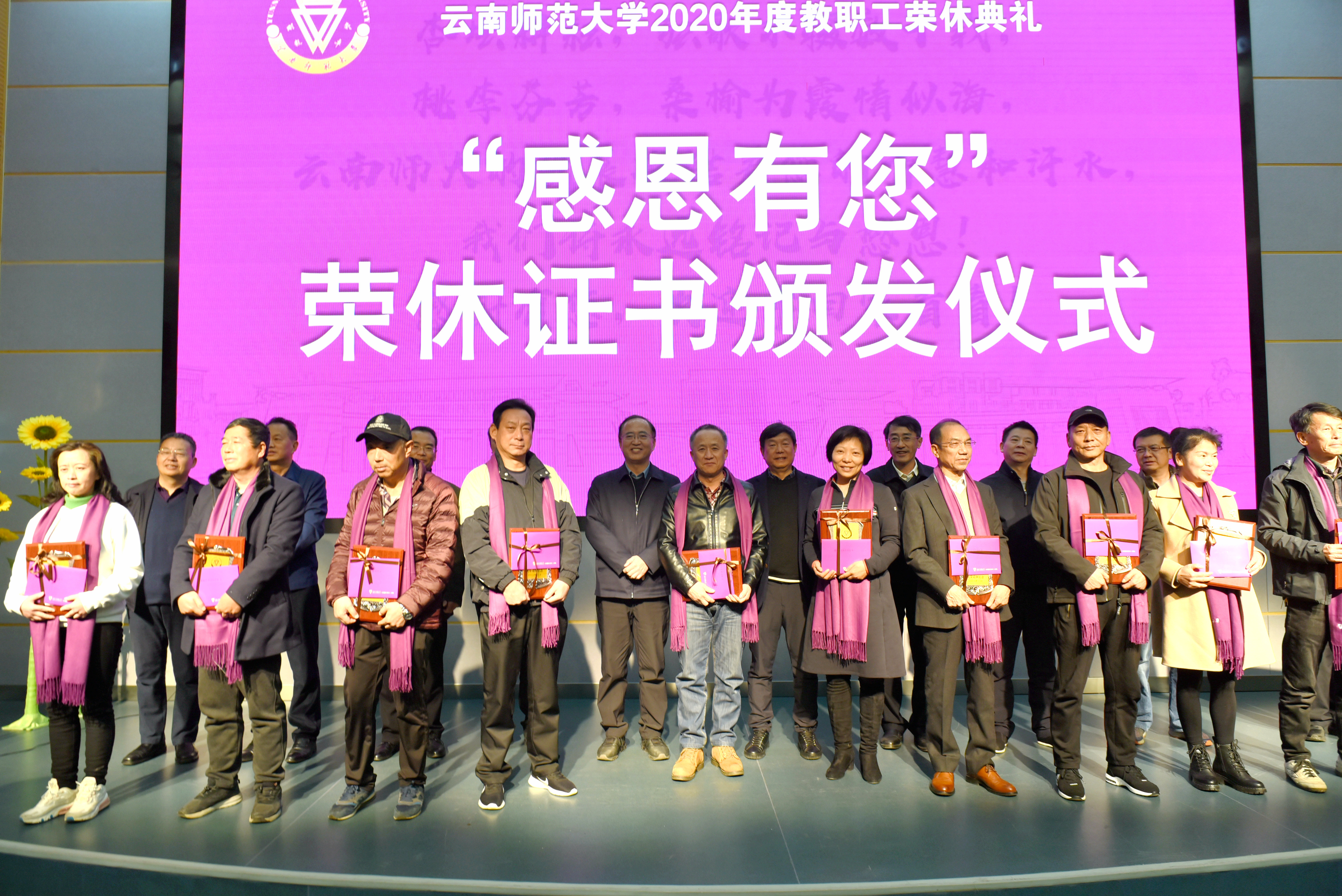 12月29日下午,永利官网2020年度教职工荣休典礼在呈贡校区西边中心报告厅举行。学校全体党政领导,2020年度退休教职工代表,各学院(学部)、各部门、直属单位、教辅单位主要负责人参加典礼。