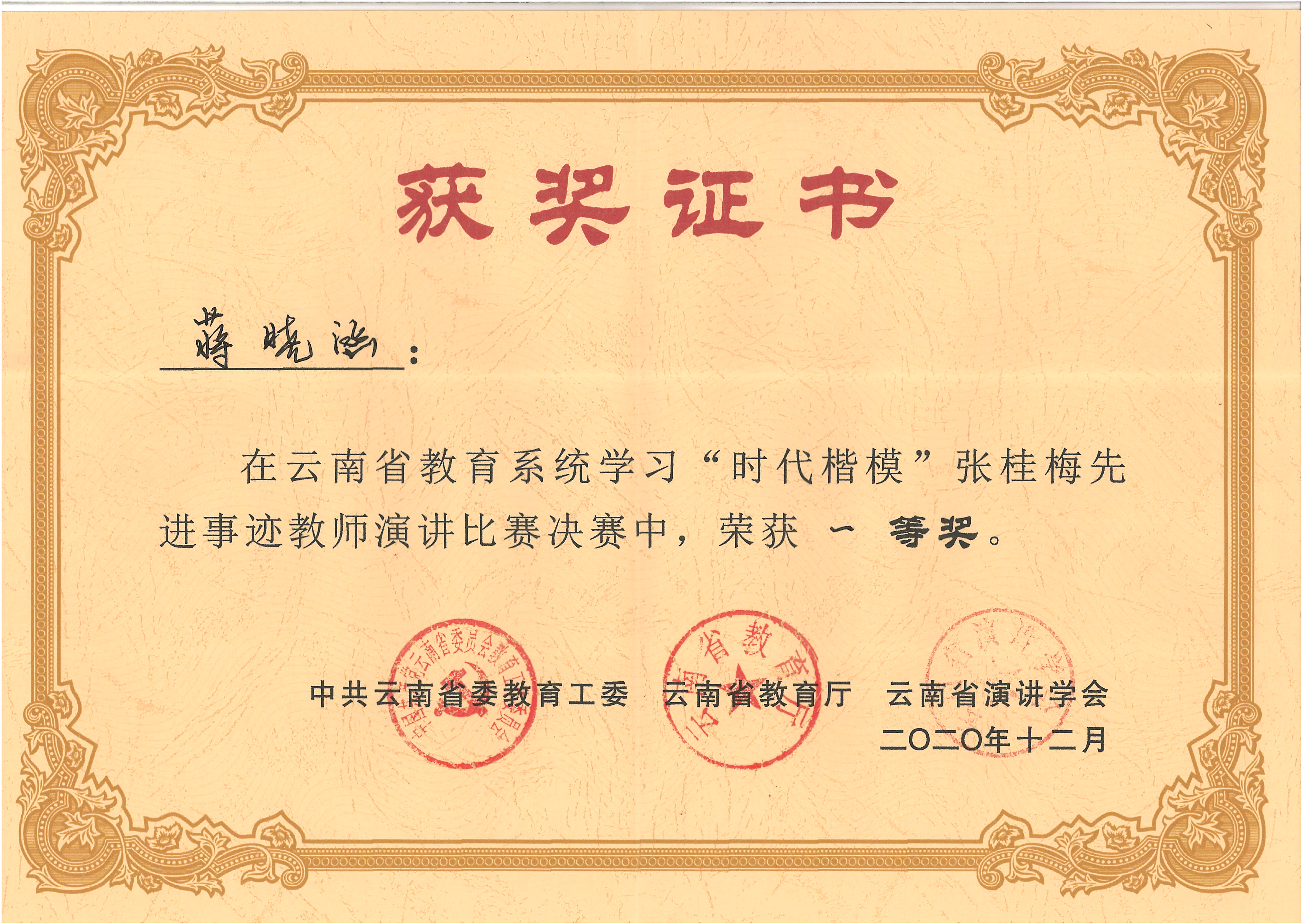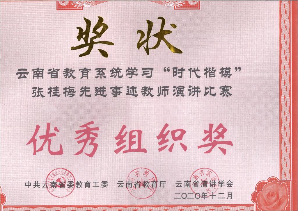 12月30日,由中共云南省委教育工委、云南省教育厅主办,云南省演讲学会、国家教育行政学院承办的学习“时代楷模”张桂梅先进事迹教师演讲比赛决赛在云南省教育厅大礼堂举行。永利官网荣获优秀组织奖,教师代表蒋晓涵老师从众多选手中脱颖而出以高比分夺得高校组第一名折桂一等奖。
