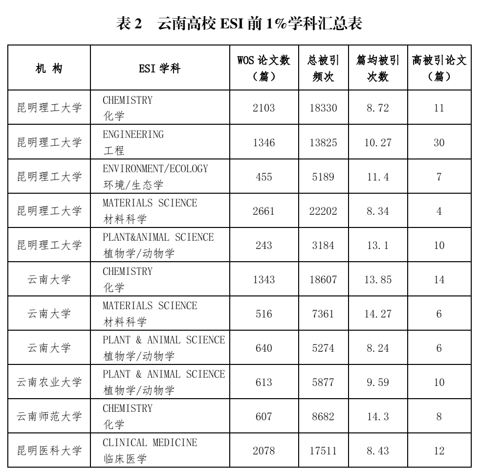 表2 云南省高校ESI前1%学科汇总表