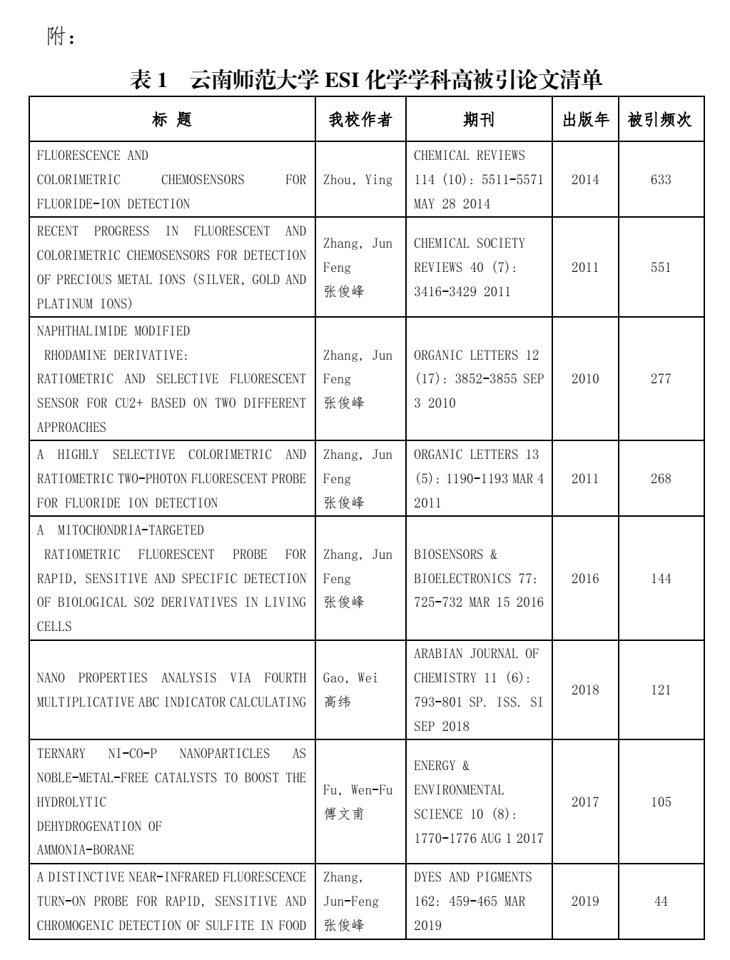 附:表1 8858cc永利唯一官方网ESI化学学科高被引论文清单
