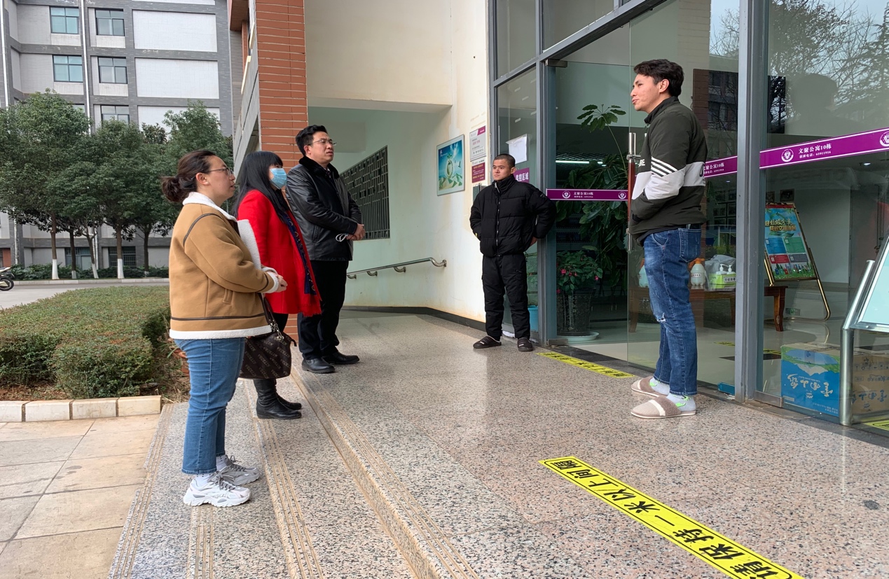 1月23日,云南华文学院王秀成院长、常数副书记、吴文莉副院长及中外学生辅导员一行5人到东区文聚10栋留学生公寓进行安全隐患排查。