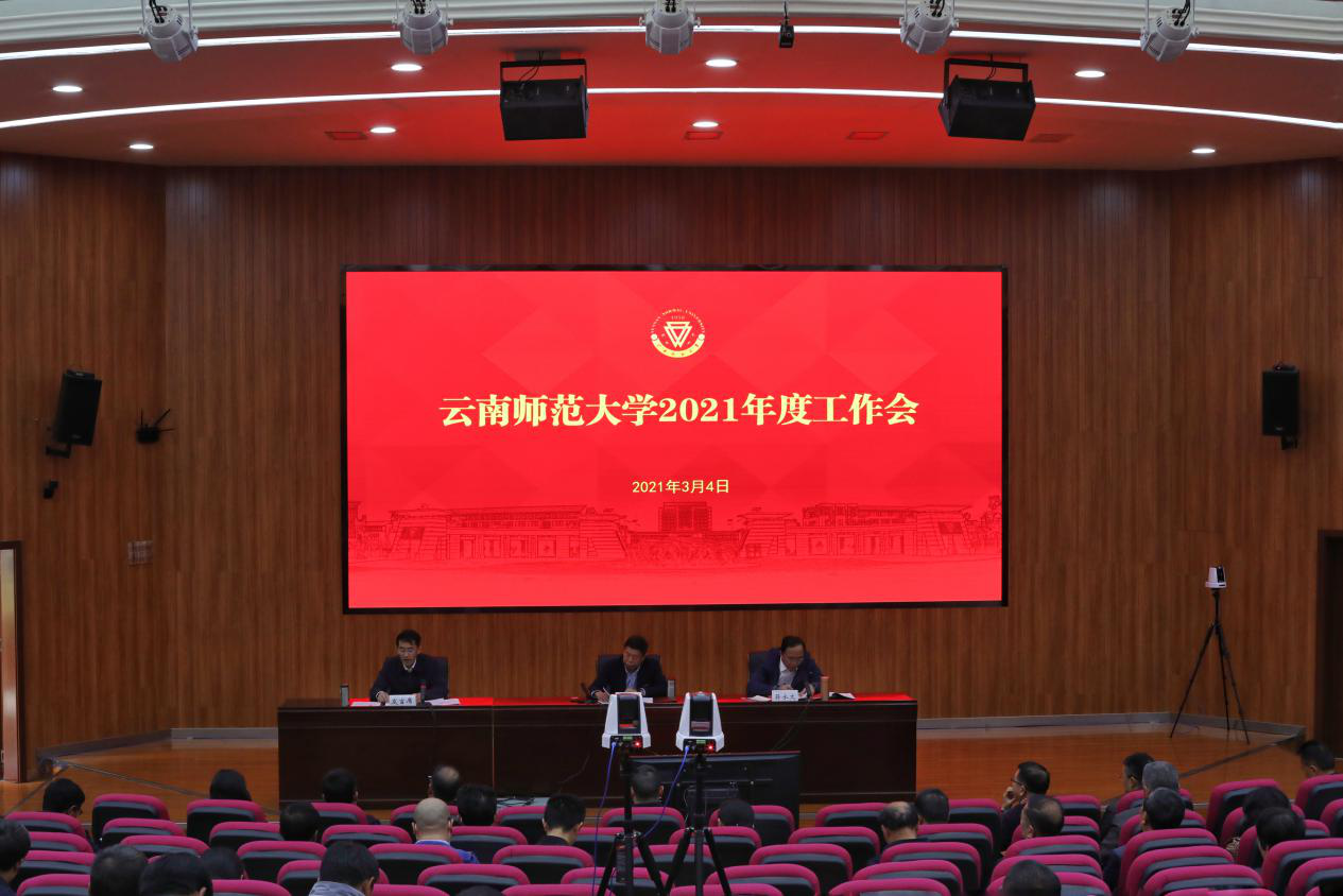 校党委书记饶卫在讲话中围绕“过去5年的工作怎么看、对新的形势该怎么认识、“十四五”开局起步怎么干、怎么样才能干好”提出了意见要求。饶卫书记指出,过去的五年,是学校改革建设发展中极不平凡的五年,学校党委聚焦第十二次党代会确定的“加快建设教师教育为特色高水平大学”奋斗目标,弘扬传统、改革创新、勇于担当、奋力攻坚,“十三五”规划圆满收官,学校“三步走”战略第一步目标基本实现,教师教育特色更加凸显,综合办学实力、学术影响力迈上了一个大台阶。云南师大“十四五”和2035年远景目标的确定,必须立足新发展阶段、贯彻新发展理念、构建新发展格局,紧紧围绕省委和省“两会”确定的“到2035年我省与全国同步基本实现社会主义现代化”这个目标来确定。学校2021年工作总体思路是:以习近平新时代中国特色社会主义思想为指导,深入贯彻落实党的十九大和十九届二中、三中、四中、五中全会精神,增强“四个意识”、坚定“四个自信”、做到“两个维护”,贯彻习近平总书记关于教育的重要论述和考察云南重要讲话、考察调研西南联大旧址重要指示精神,立足新发展阶段、贯彻新发展理念、构建新发展格局,以推动实现高质量发展为主题,以改革创新为根本动力,坚持和加强党对学校工作的全面领导,全面贯彻党的教育方针,落实立德树人根本任务,坚持党建抓组织、党风廉政建设抓政治生态、改革抓体制、安全抓责任、整体抓质量,不断巩固拓展疫情防控和改革发展成果,推进学校治理体系和治理能力现代化,确保“十四五”开好局、起好步,以优异成绩庆祝建党100周年。结合党中央、省委重要会议文件精神,饶书记强调了学校2021年六个方面的重点工作:一是以庆祝建党百年为契机,进一步加强党对学校工作的全面领导,全面提升党的建设质量;二是牢牢把握“党的盛典、人民的节日”定位,精心组织筹划好建党100周年宣传教育庆祝活动;三是牢记初心使命,全面抓好党史学习教育;四是从严从实抓好中央巡视反馈意见整改落实;五是科学编制好“十四五”规划;六是确保校园安全和谐稳定。站在新的历史起点上,推进学校实现高质量发展责任重大、使命光荣,要更加紧密地团结在以习近平同志为核心的党中央周围,在省委、省政府、省委教育工委、省教育厅的正确领导下,不忘初心、牢记使命,扎实工作、开拓进取,全面推进教师教育为特色高水平大学建设,努力办好人民满意的教育,为全面建成教育强省、教育强国,建设社会主义现代化国家、实现中华民族伟大复兴的中国梦作出新的更大贡献。
